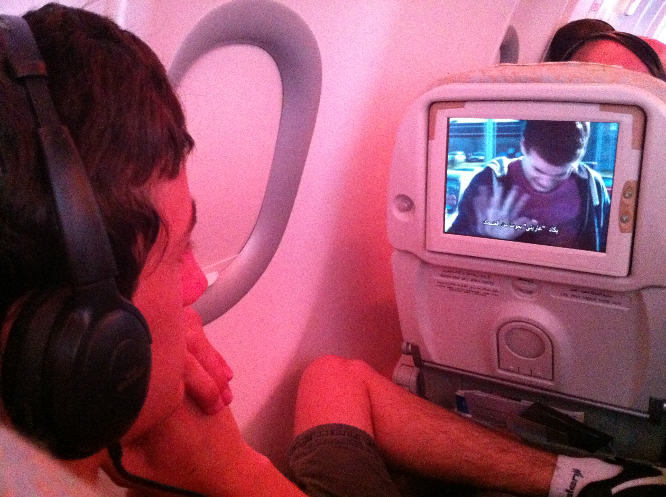 Ça y est nous décollons a ~11h pour 6h de voyage et pour une première escale à Abu Dhabi dans les Emirats Arabes. En rentrant dans l’avion, les enfants sont comme des fous en voyant qu’il y a une télé sur chaque siège.