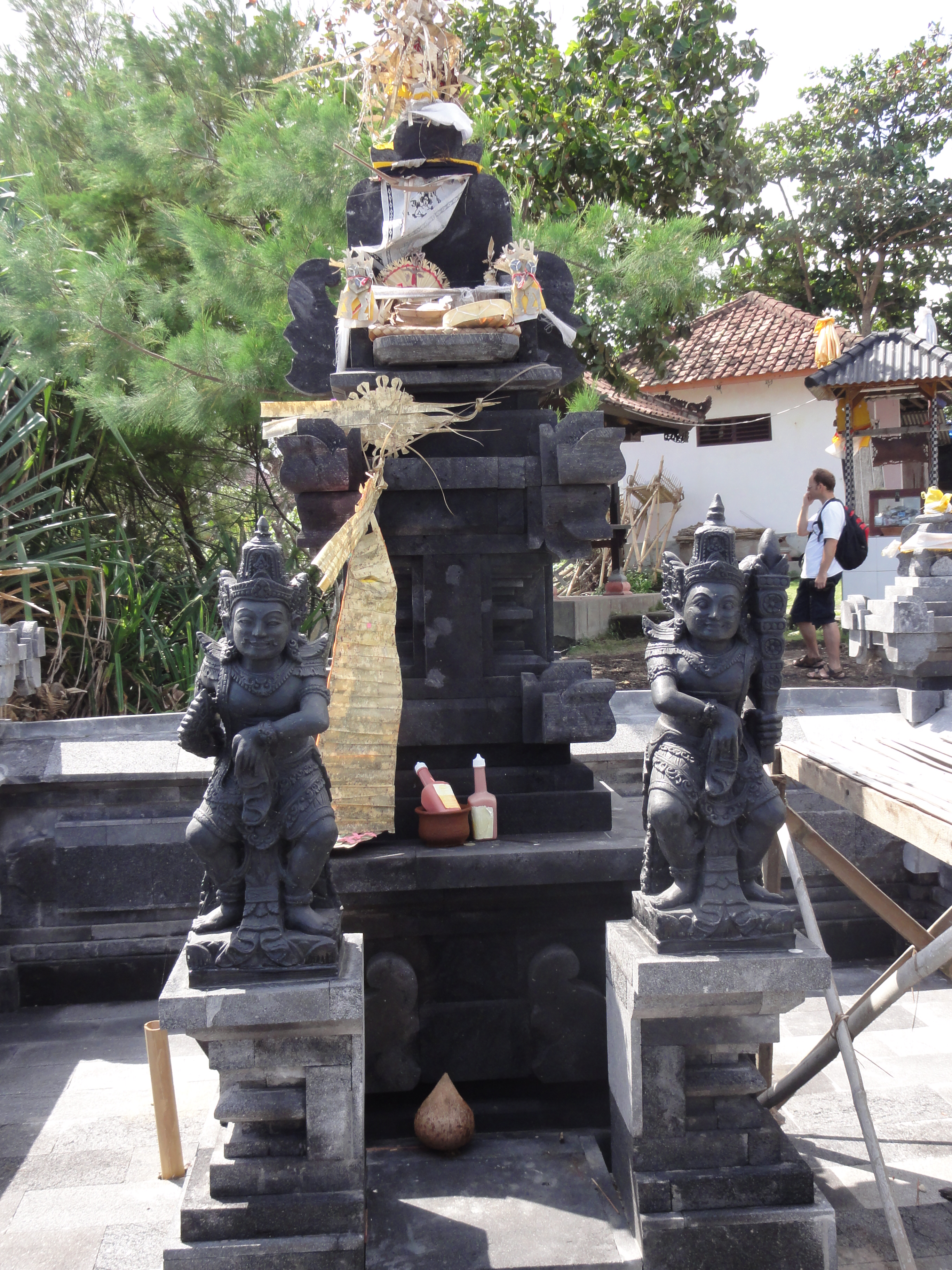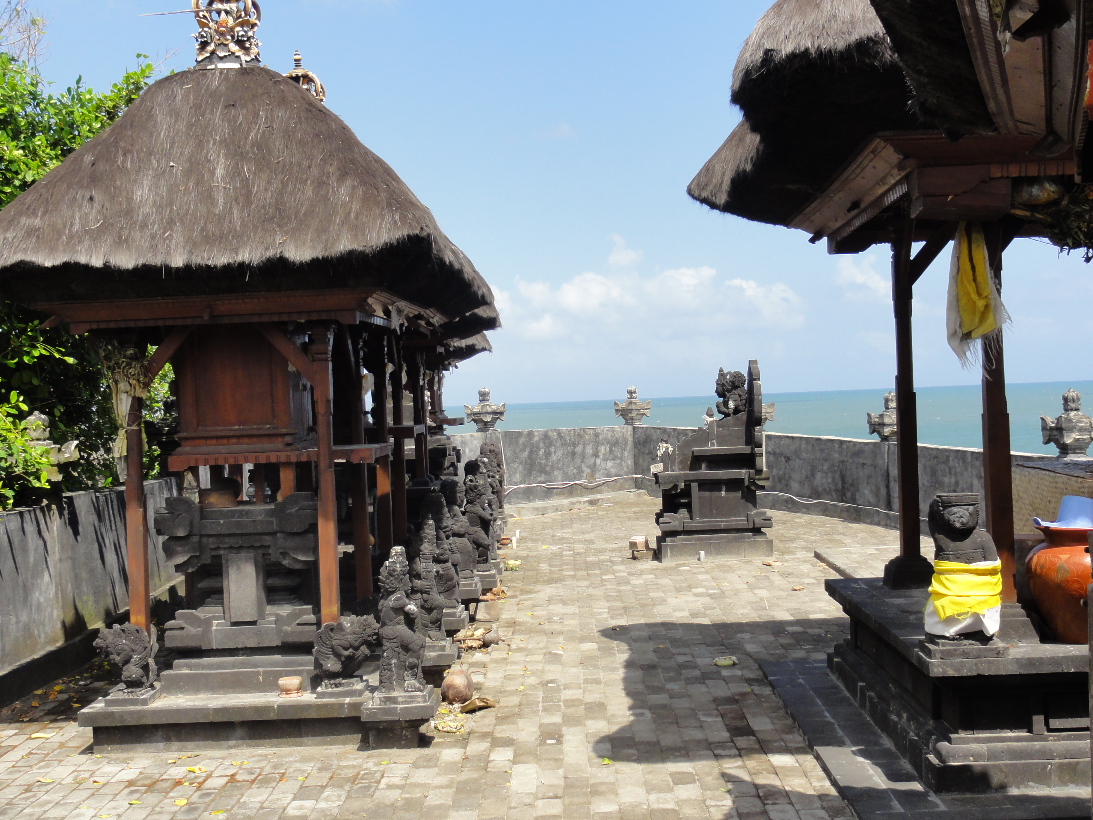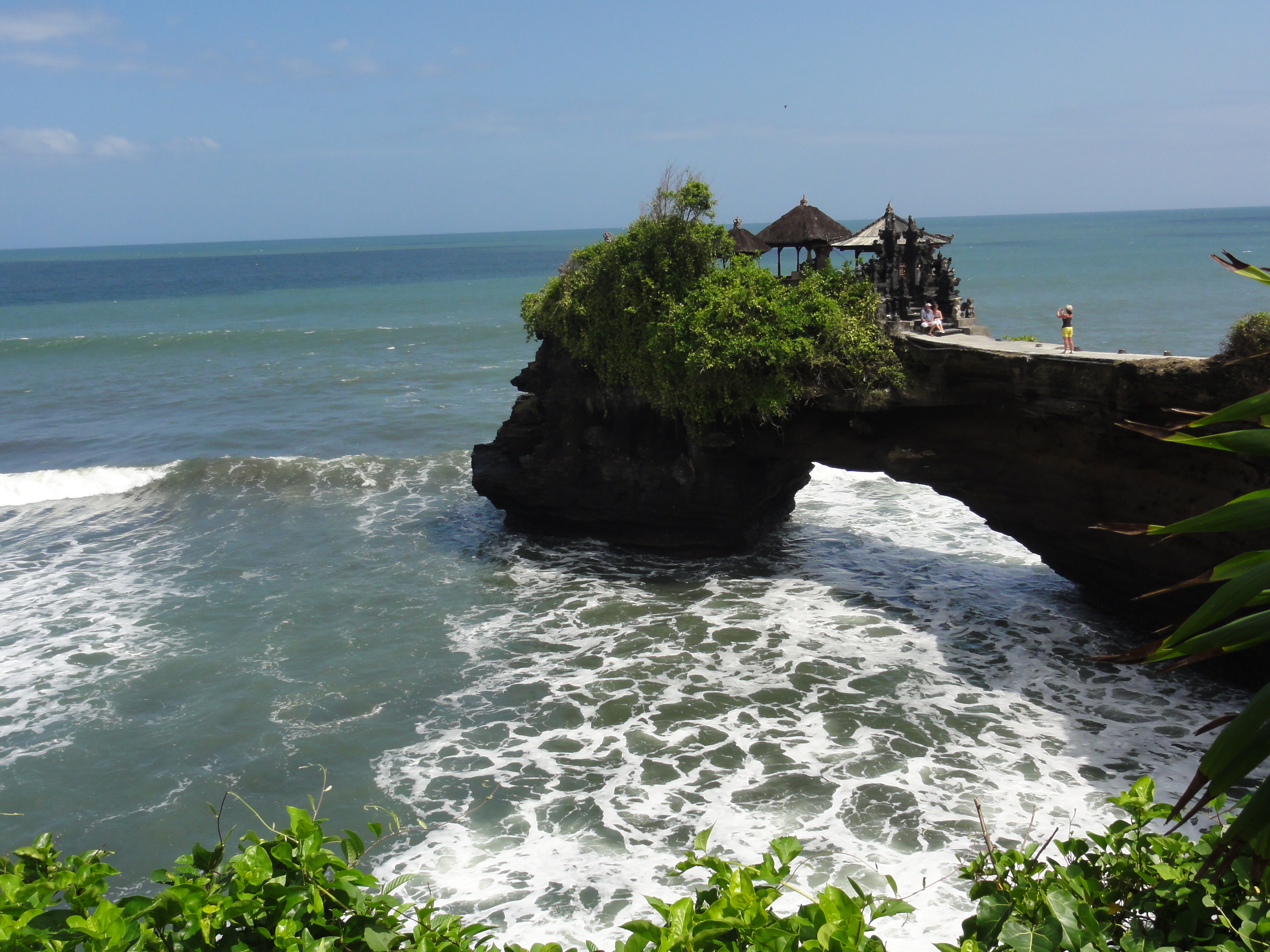 La mer est cependant assez basse pour que Thomas puisse accéder à une grotte creusée dans la roche, juste en face du temple. Nous montons dans le village pour avoir une autre vue sur le temple. En fait ce n’est qu’une succession de boutiques et de vendeurs qui nous interpellent pour nous vendre des Sarong et souvenirs divers.