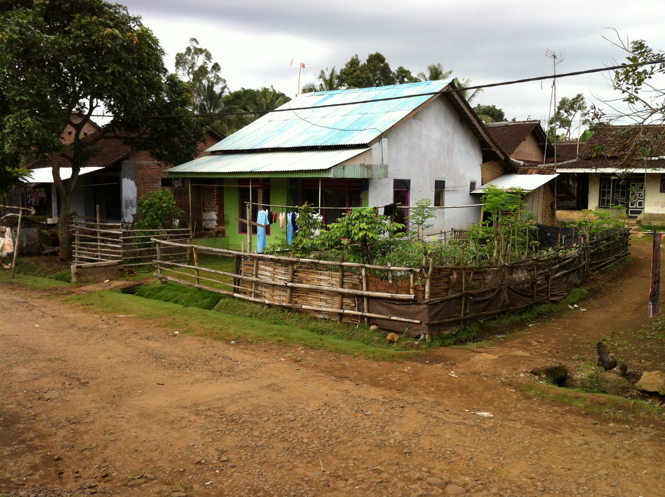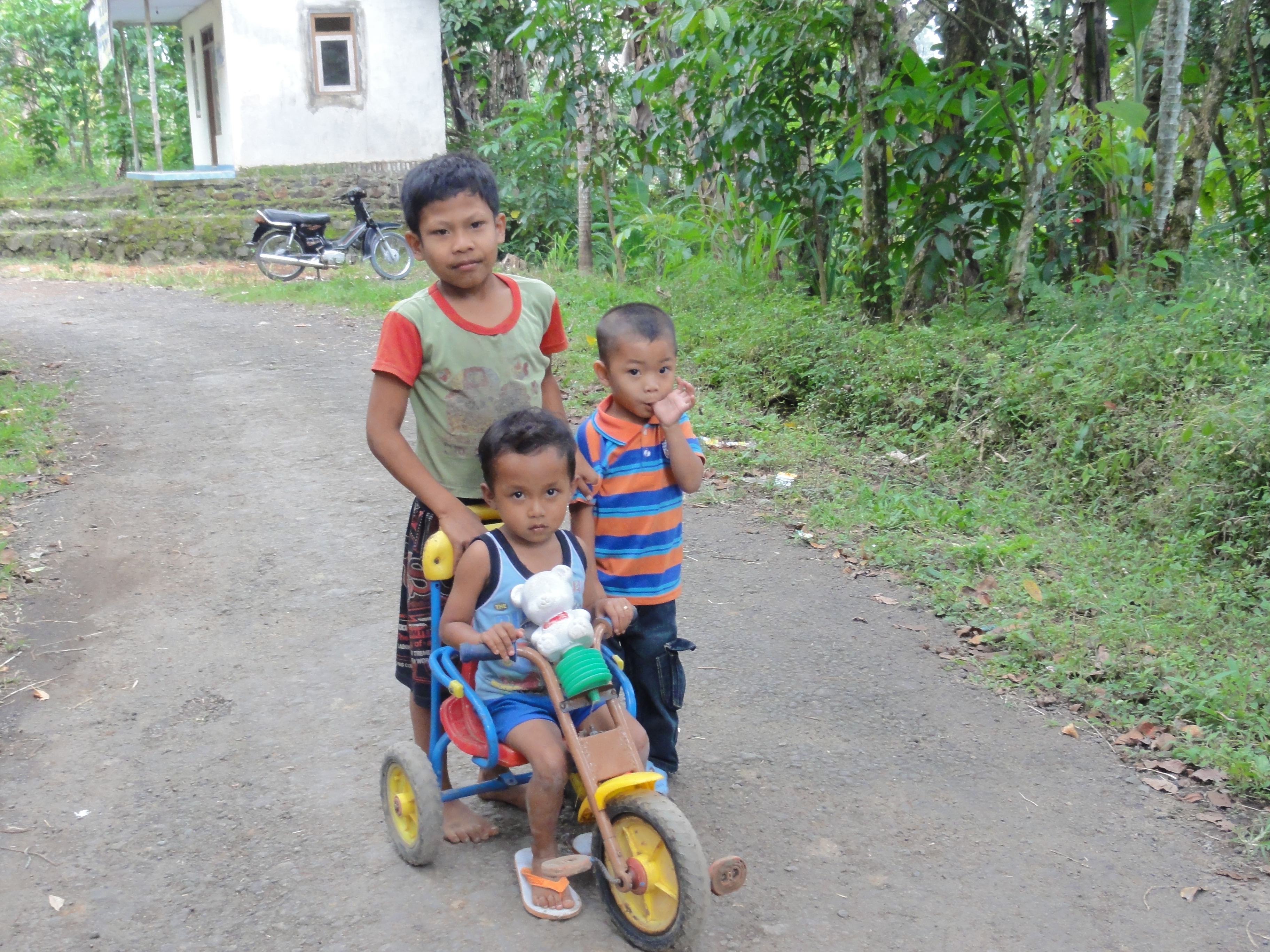 Nous en profitons pour donner aux enfants quelques élastiques colorés à mettre autour du bras et quelques autocollants. ils sont super contents. Le frère de Mr Paing nous invite également à boire le thé, manger de la pastèque et des tartines de confiture. Sa maison contraste énormément avec le reste du village. Maison très moderne et qui illustre une certaine richesse (carrelage). Bref, un accueil très chaleureux et des enfants très curieux de partout. Pierre-jean est resté près de la maison pour discuter avec les enfants du village, surtout avec un qui apprend l’anglais, aussi un peu en indonésien (merci le dictionnaire) et beaucoup avec les mains. C’est assez drôle, surtout quand les adultes s’en sont mêlés.