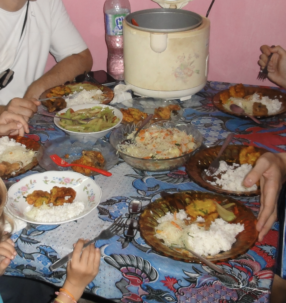 A cause du ramadan, nous ne pouvons manger le repas devant les villageois mais vers 15h, Mr Paing nous conduit dans sa cuisine où un délicieux et copieux repas indonésien nous attend. Nous nous régalons.