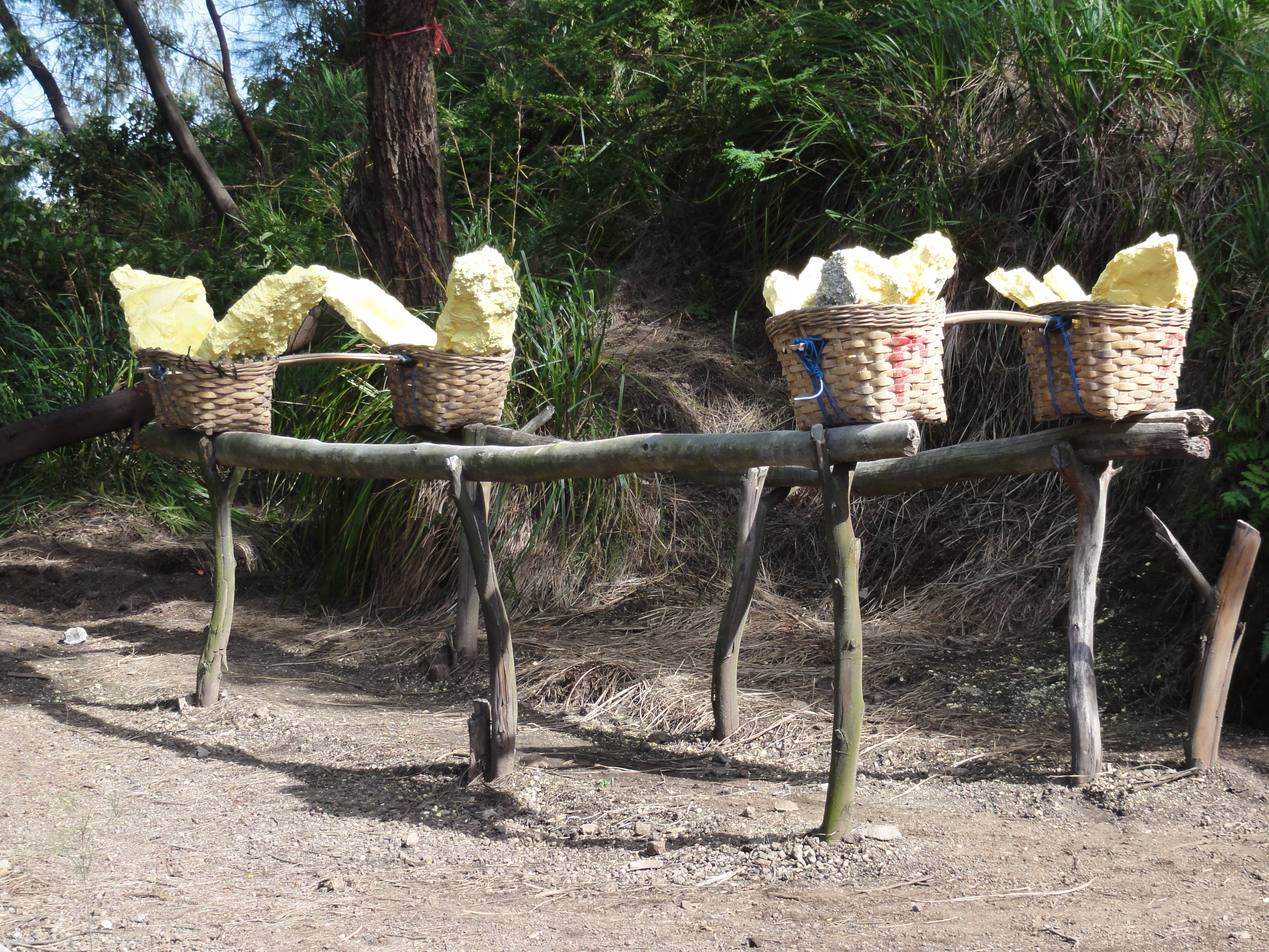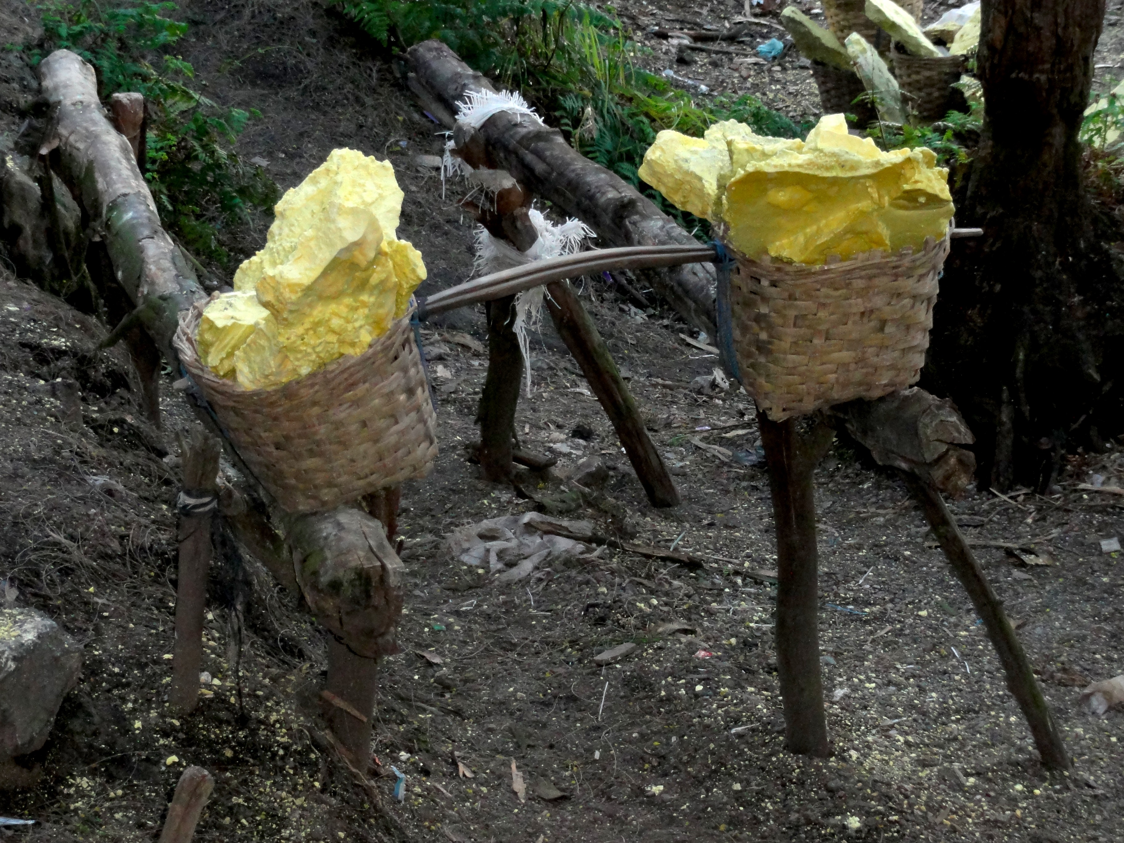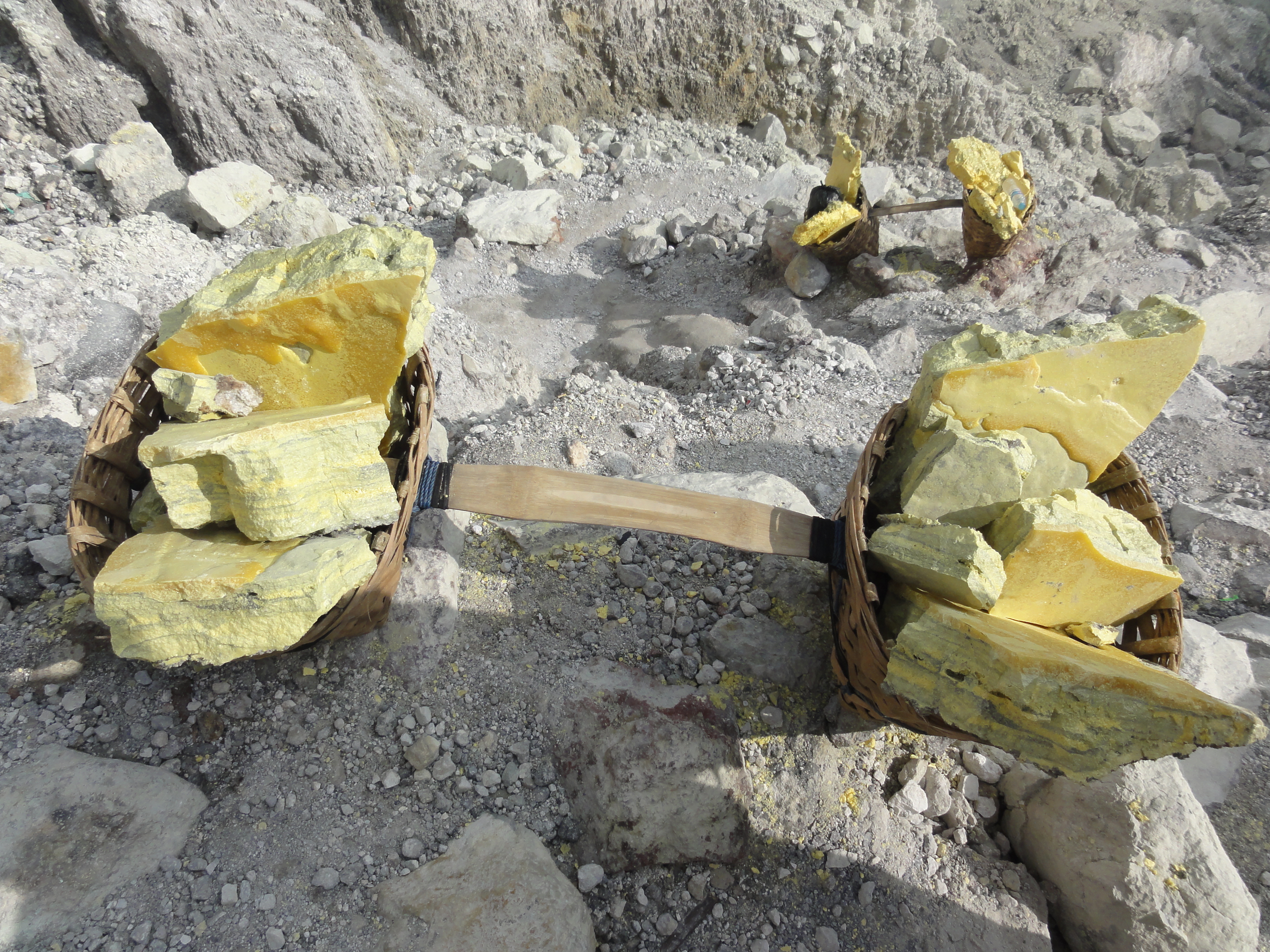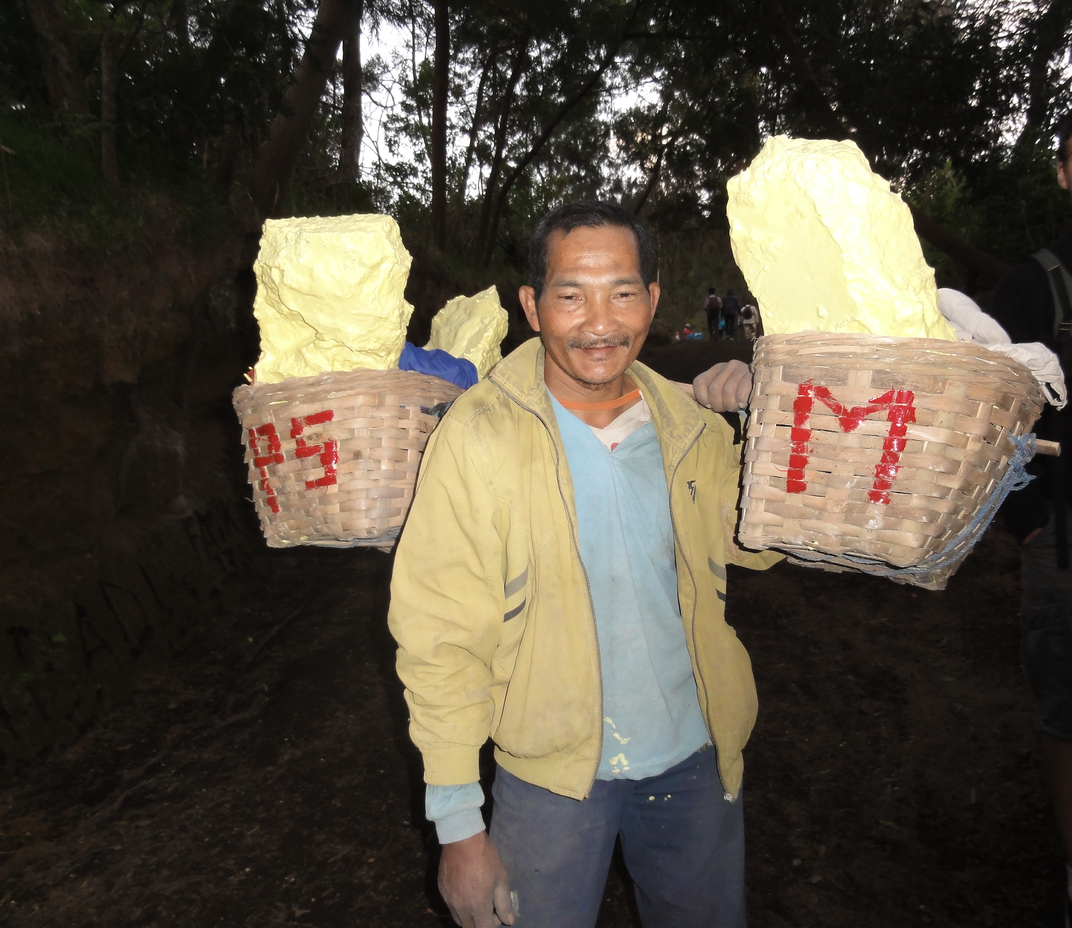 Un des porteurs a 96 kg de soufre sur le dos, les autres entre 70 et 80 kg répartis de manière équilibrée dans leurs 2 paniers.