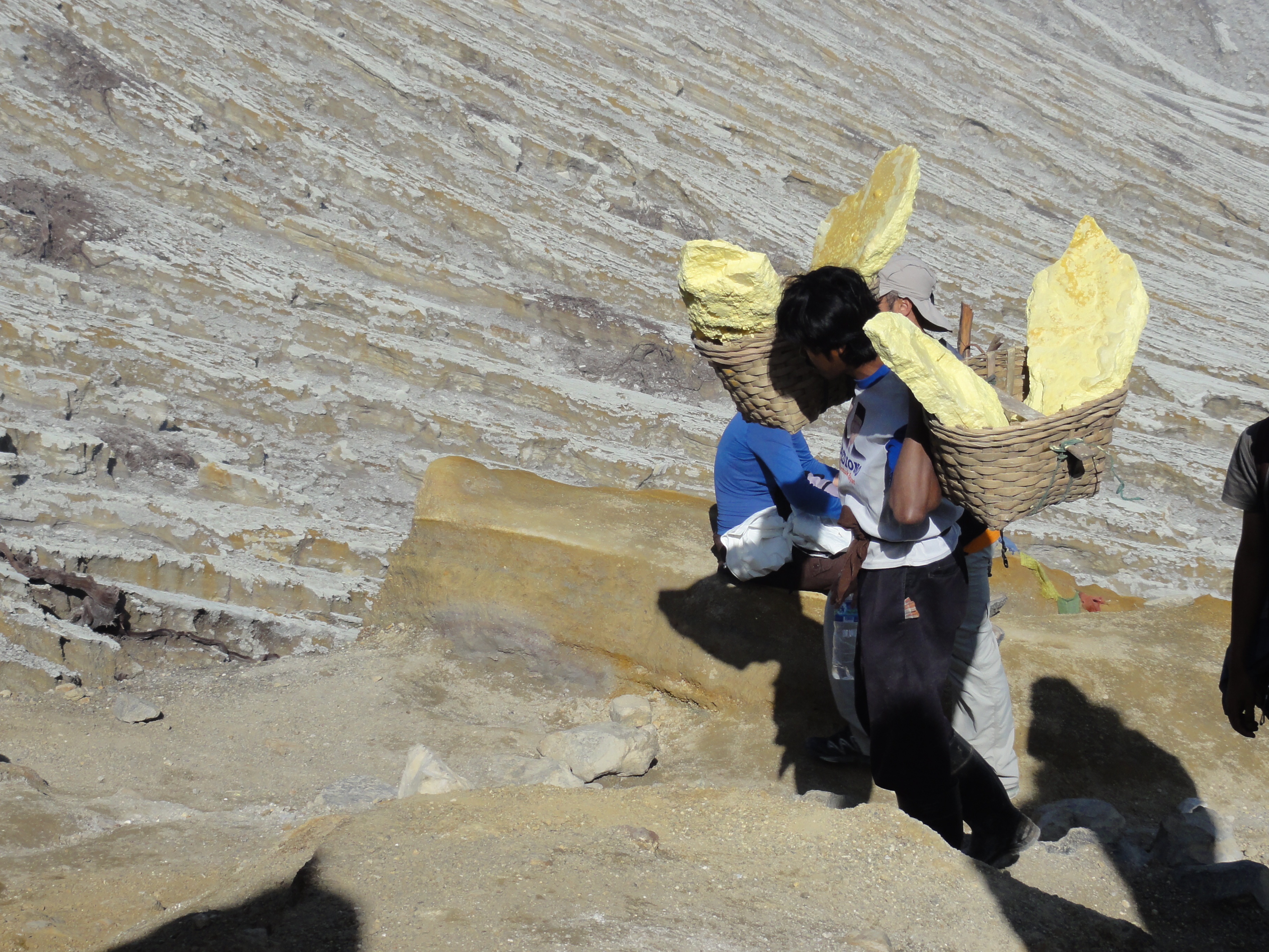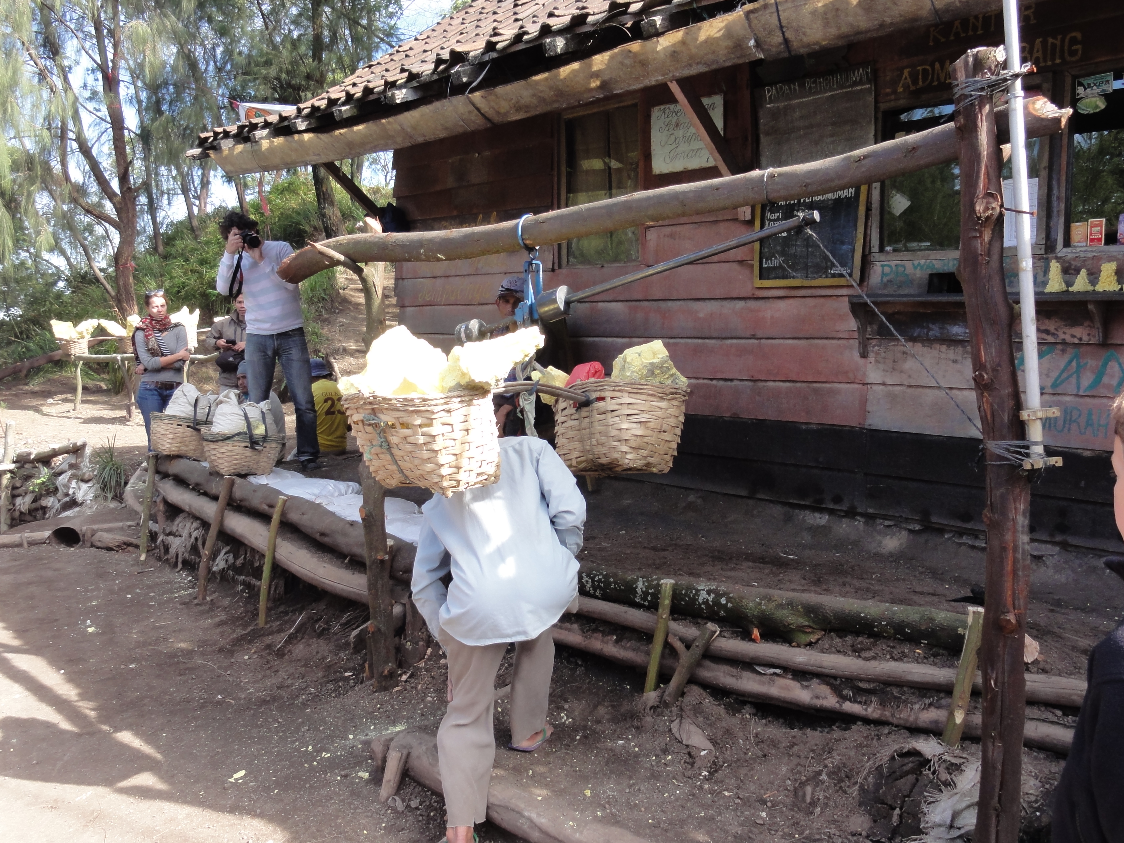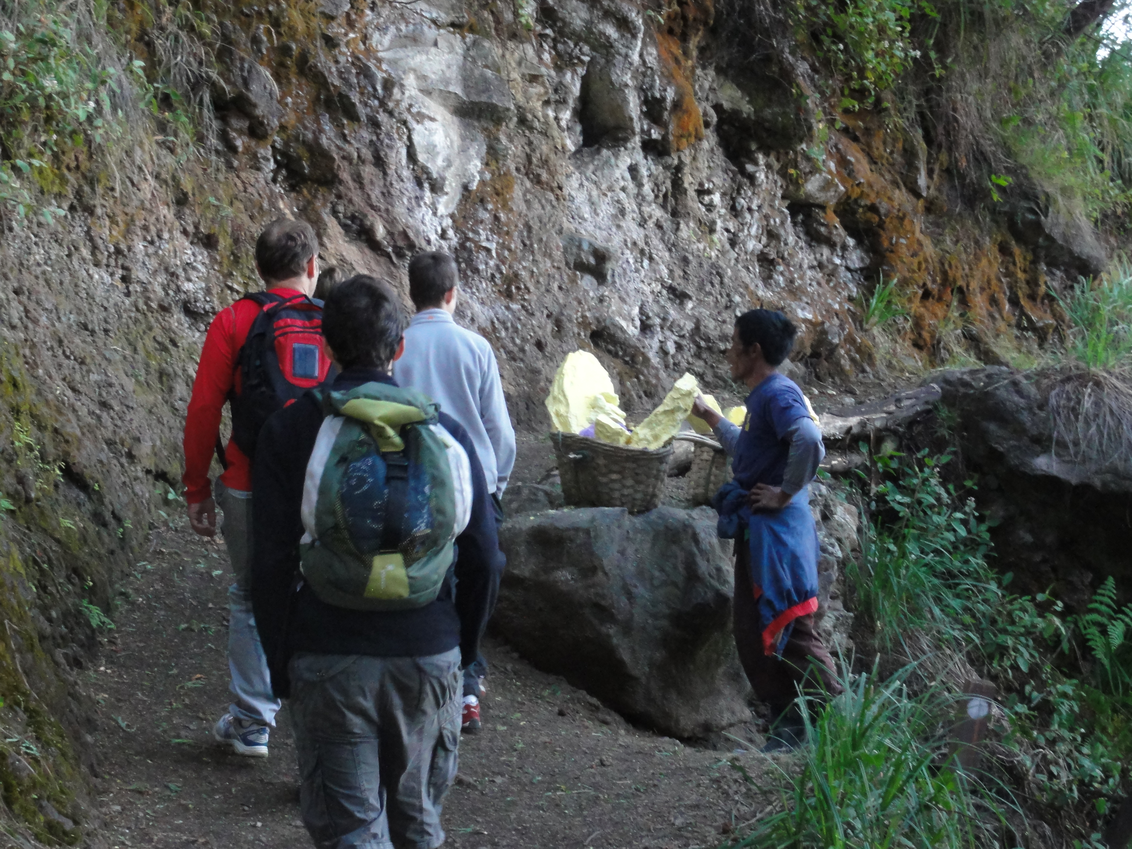Après 1h de grimpette en compagnie de porteurs de soufre, nous atteignons la cabane des mineurs où nous prenons 1 petit encas pour récupérer.