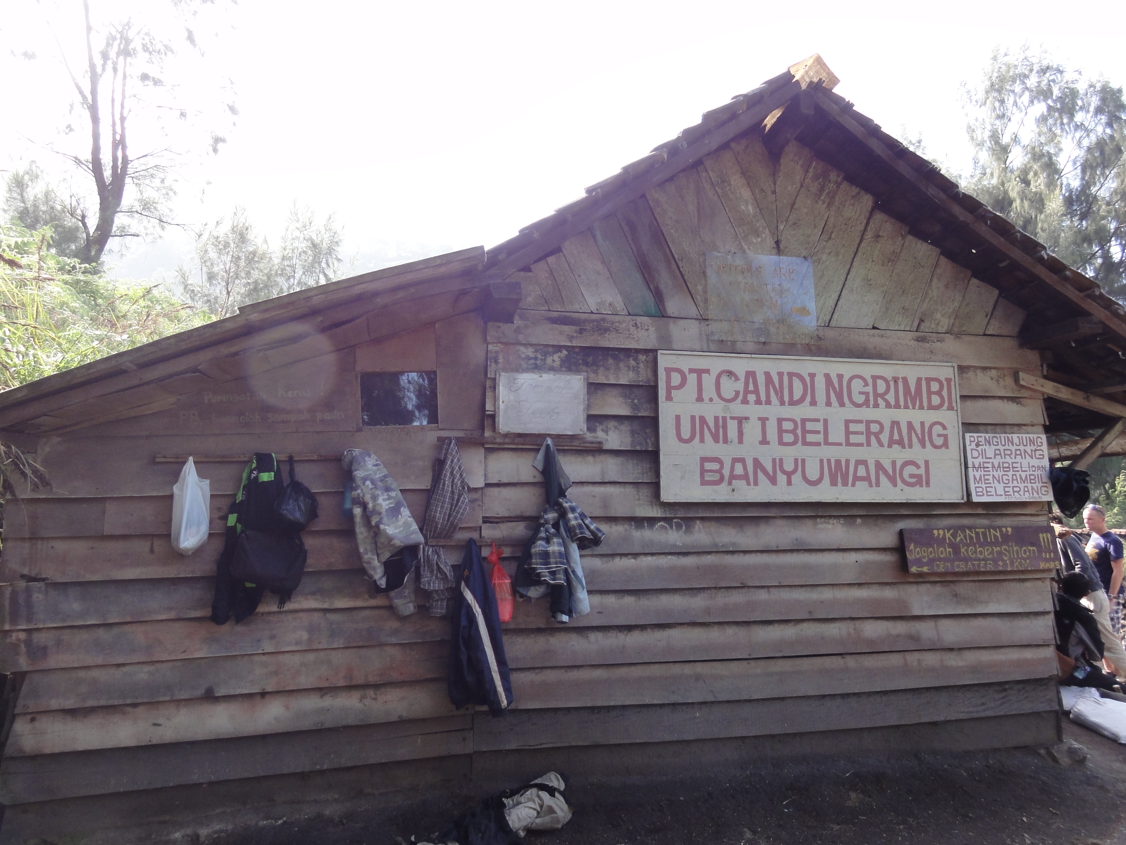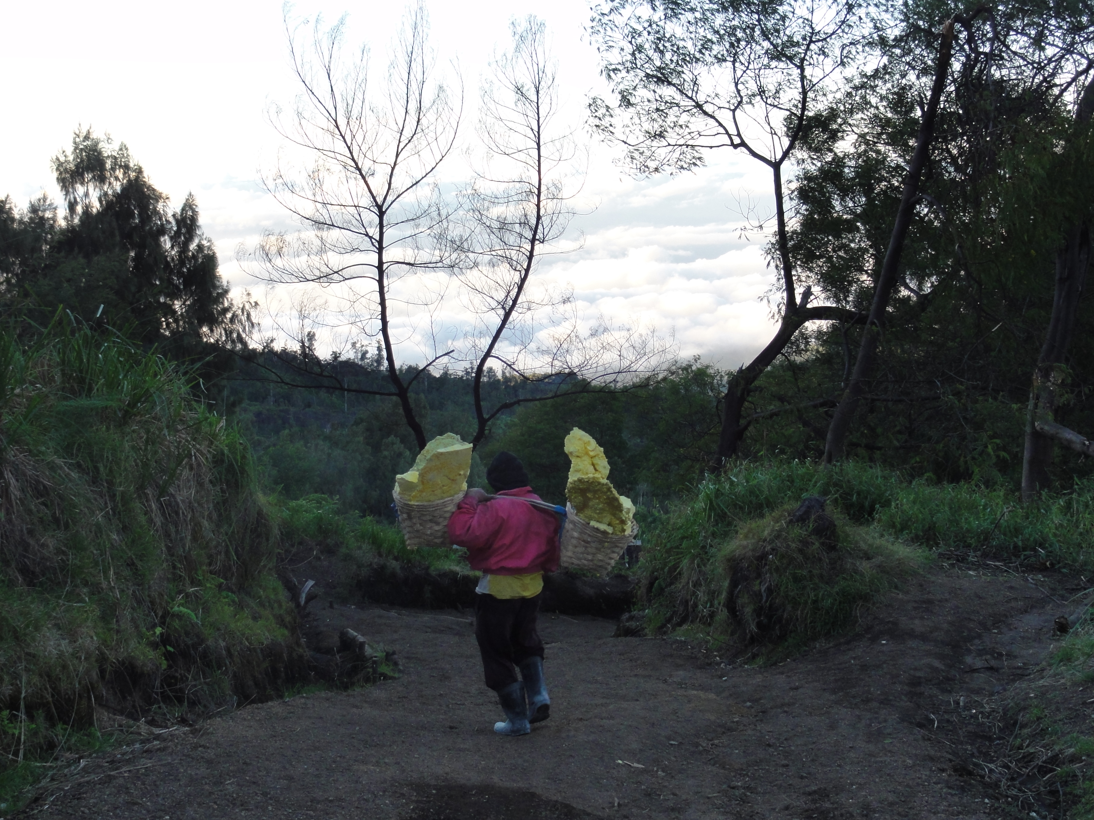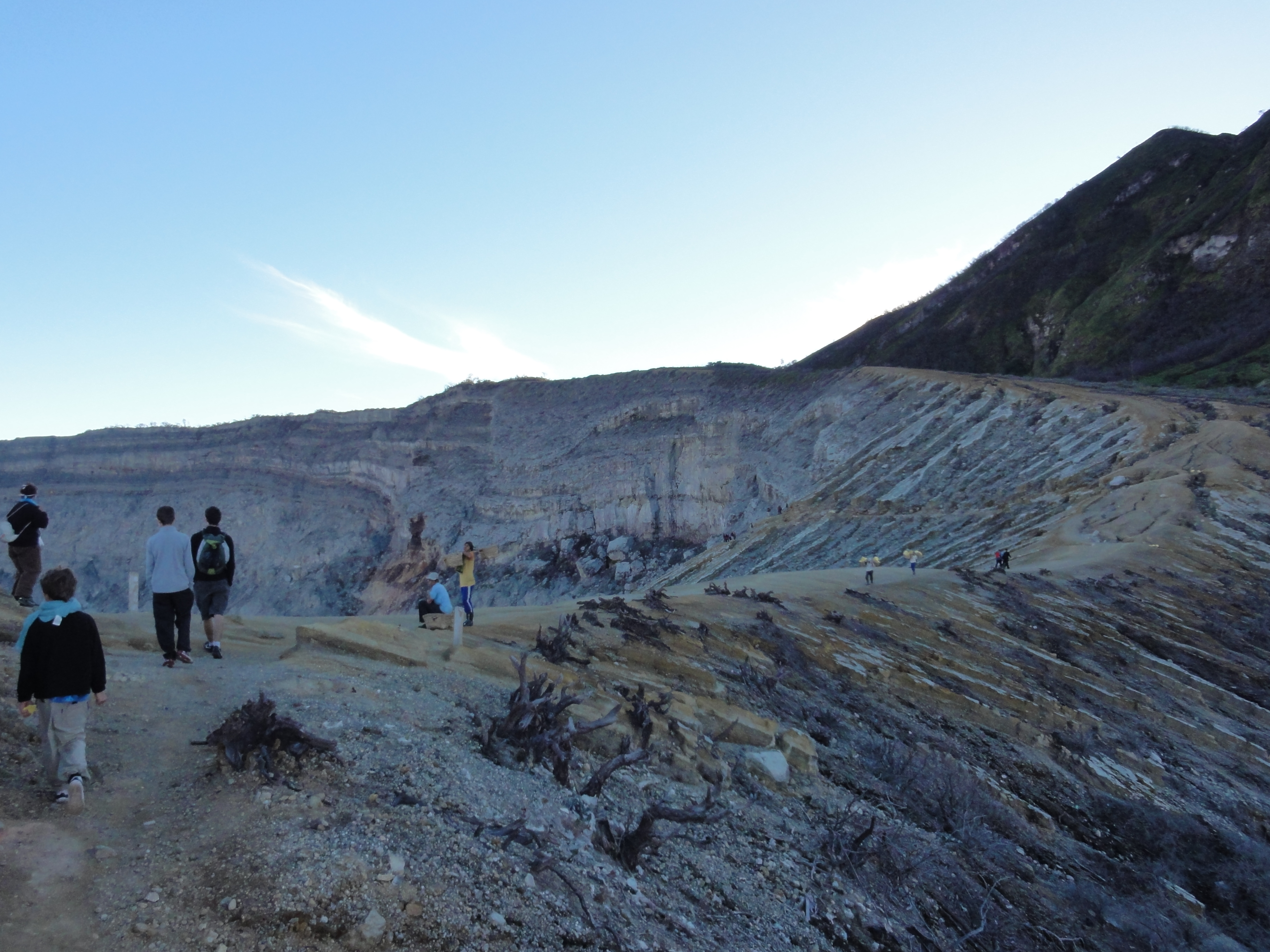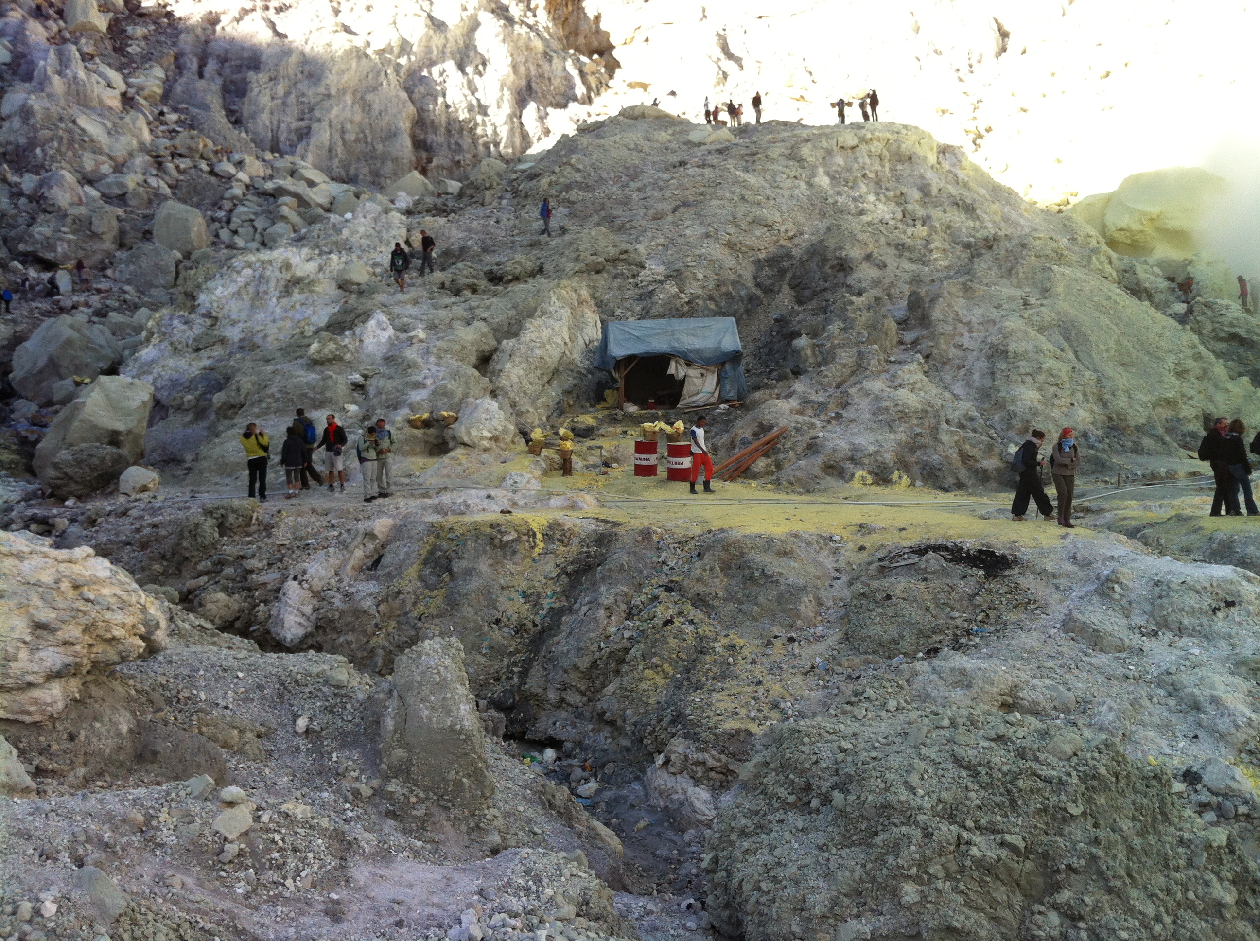 Après 1h de grimpette en compagnie de porteurs de soufre, nous atteignons la cabane des mineurs où nous prenons 1 petit encas pour récupérer.
