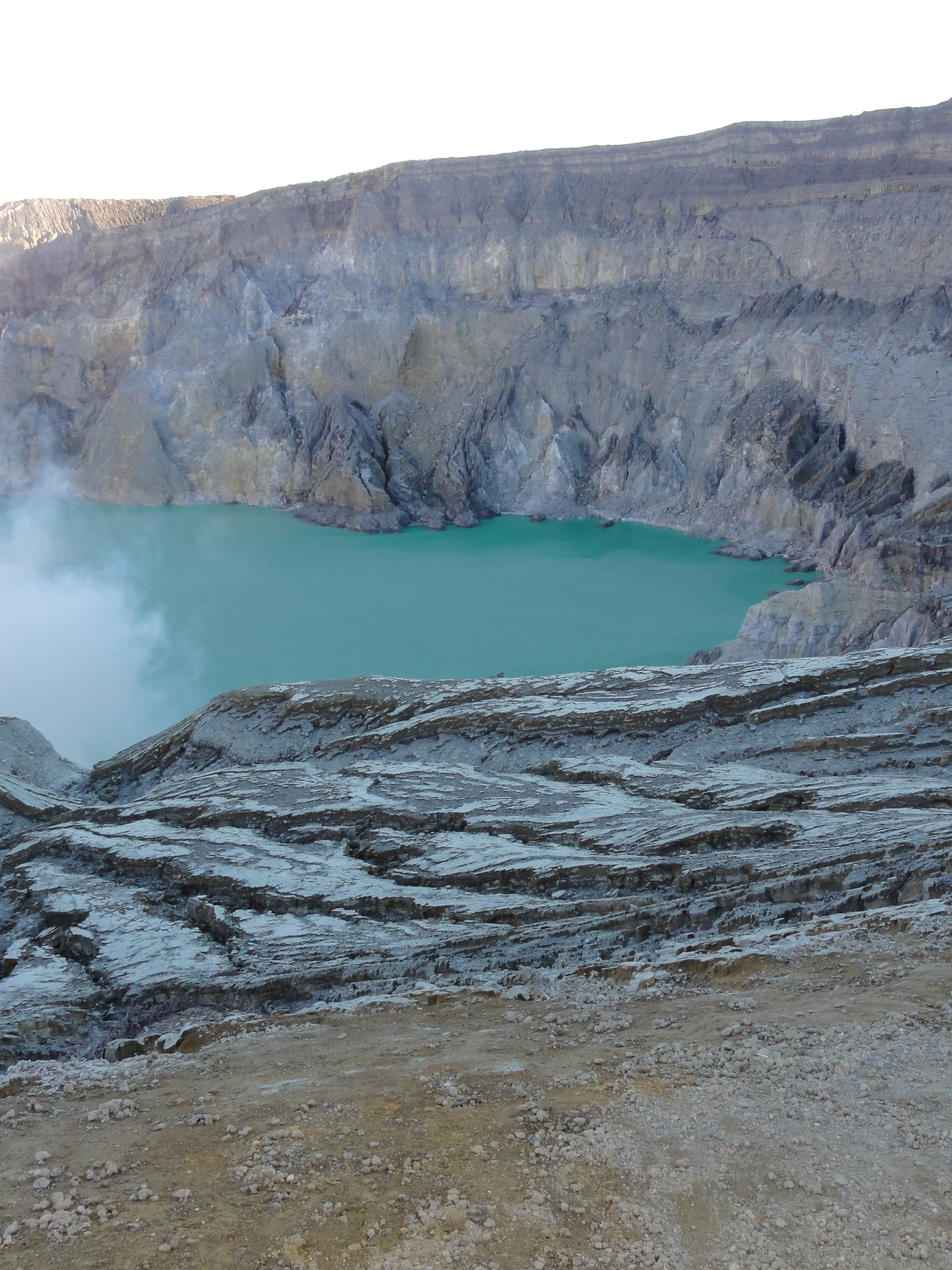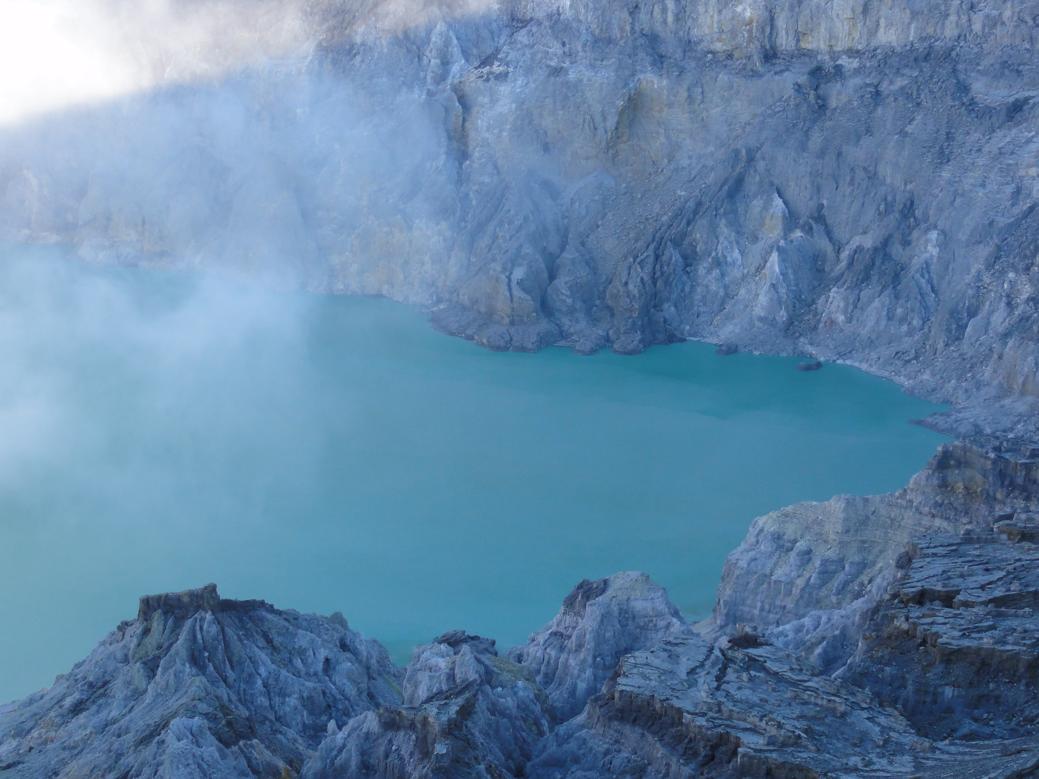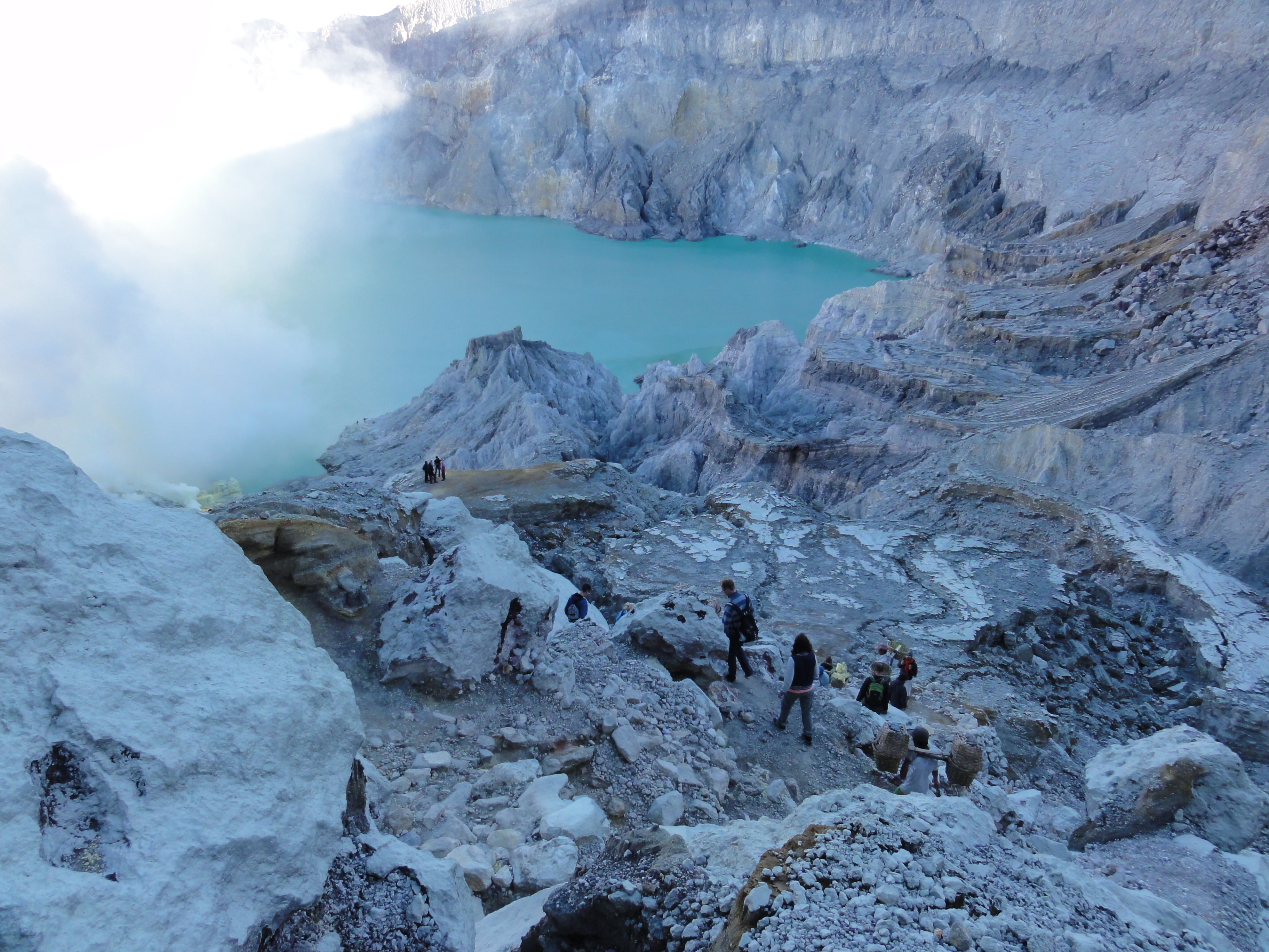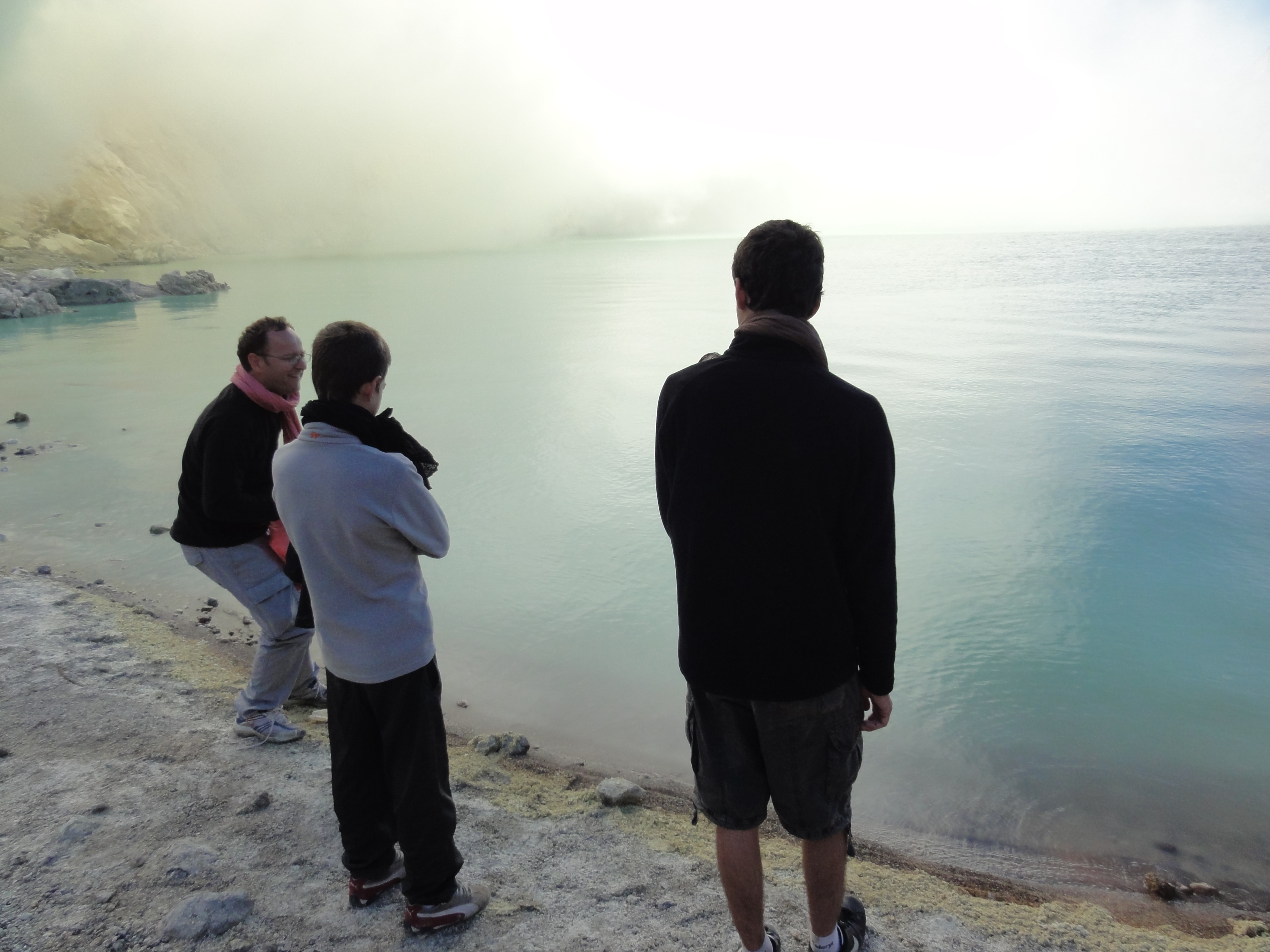 30 min encore de marche et nous atteignons la crête où le lac acide se dévoile entre les vapeurs de soufre. Le vent est avec nous et dégage complètement la mine de soufre et le lac de couleur verte.