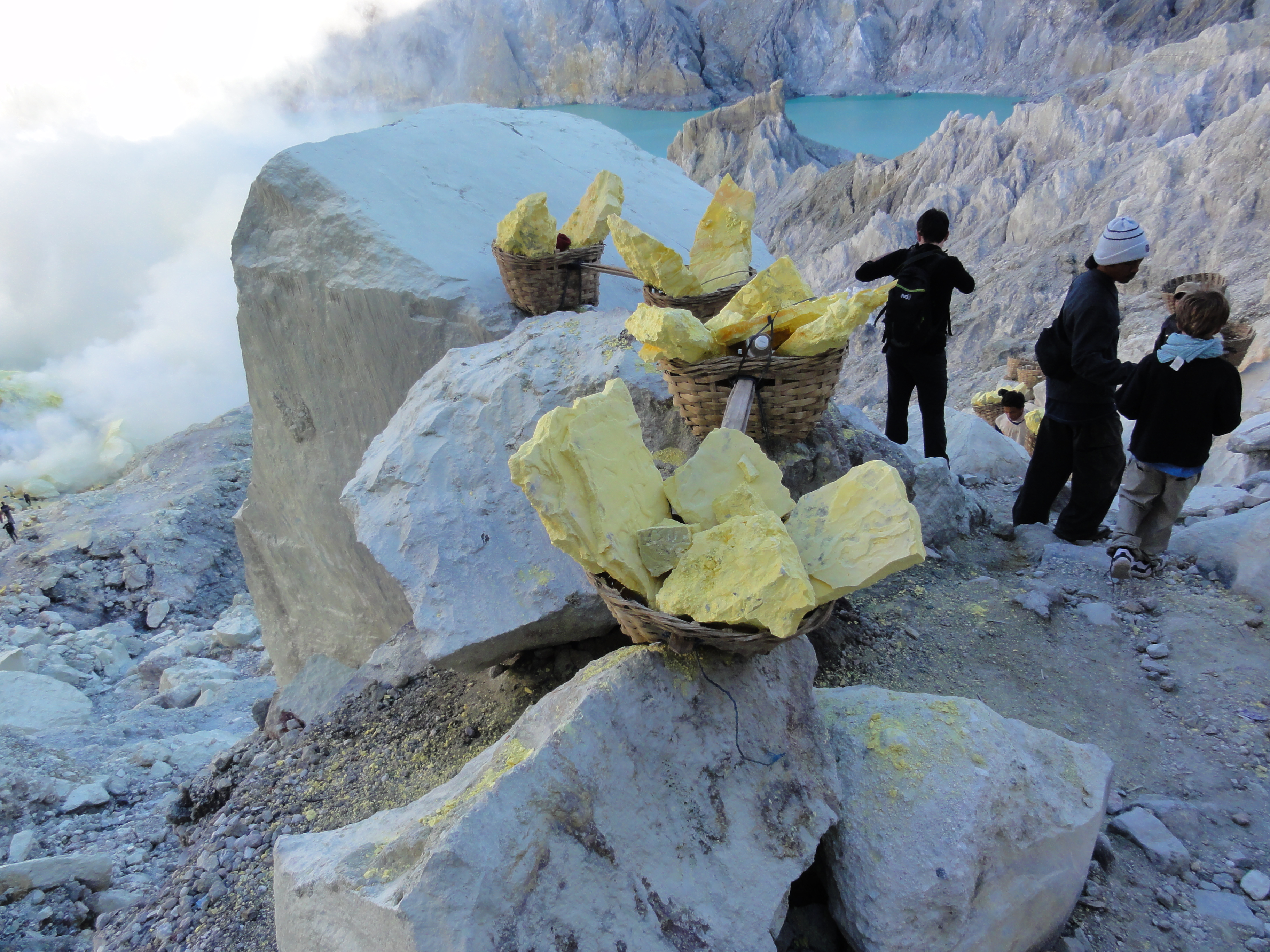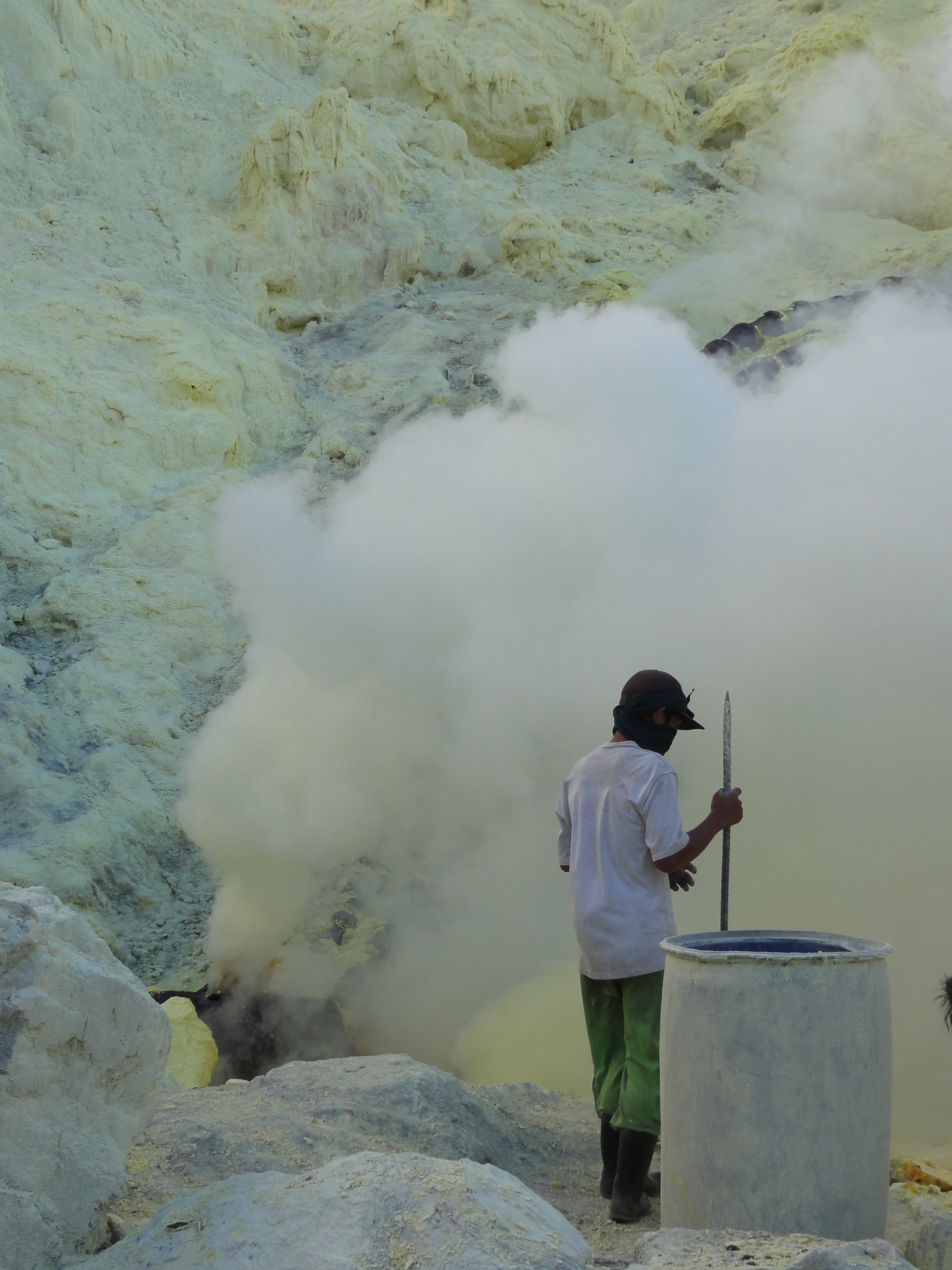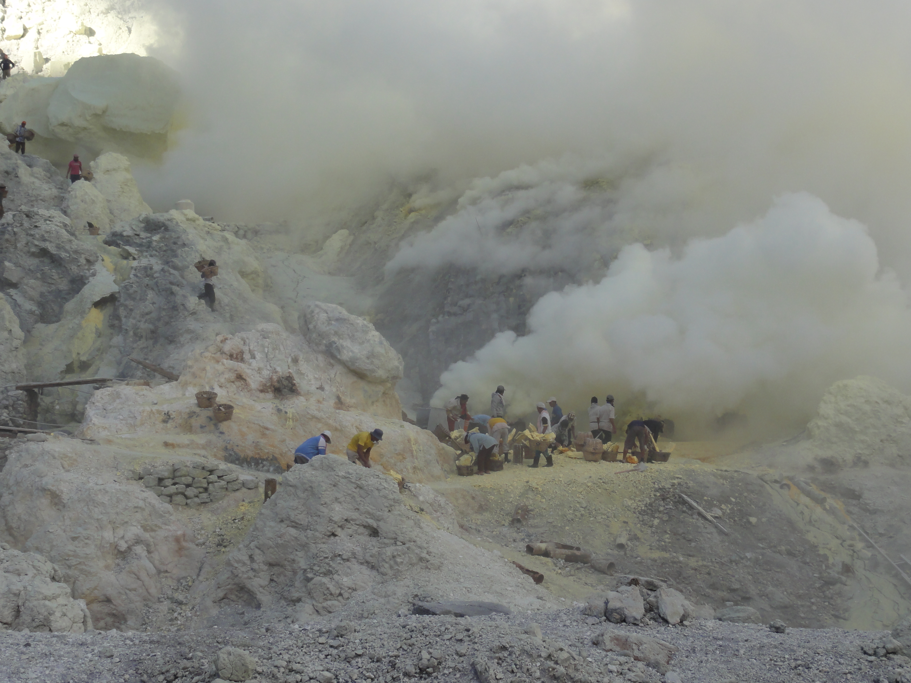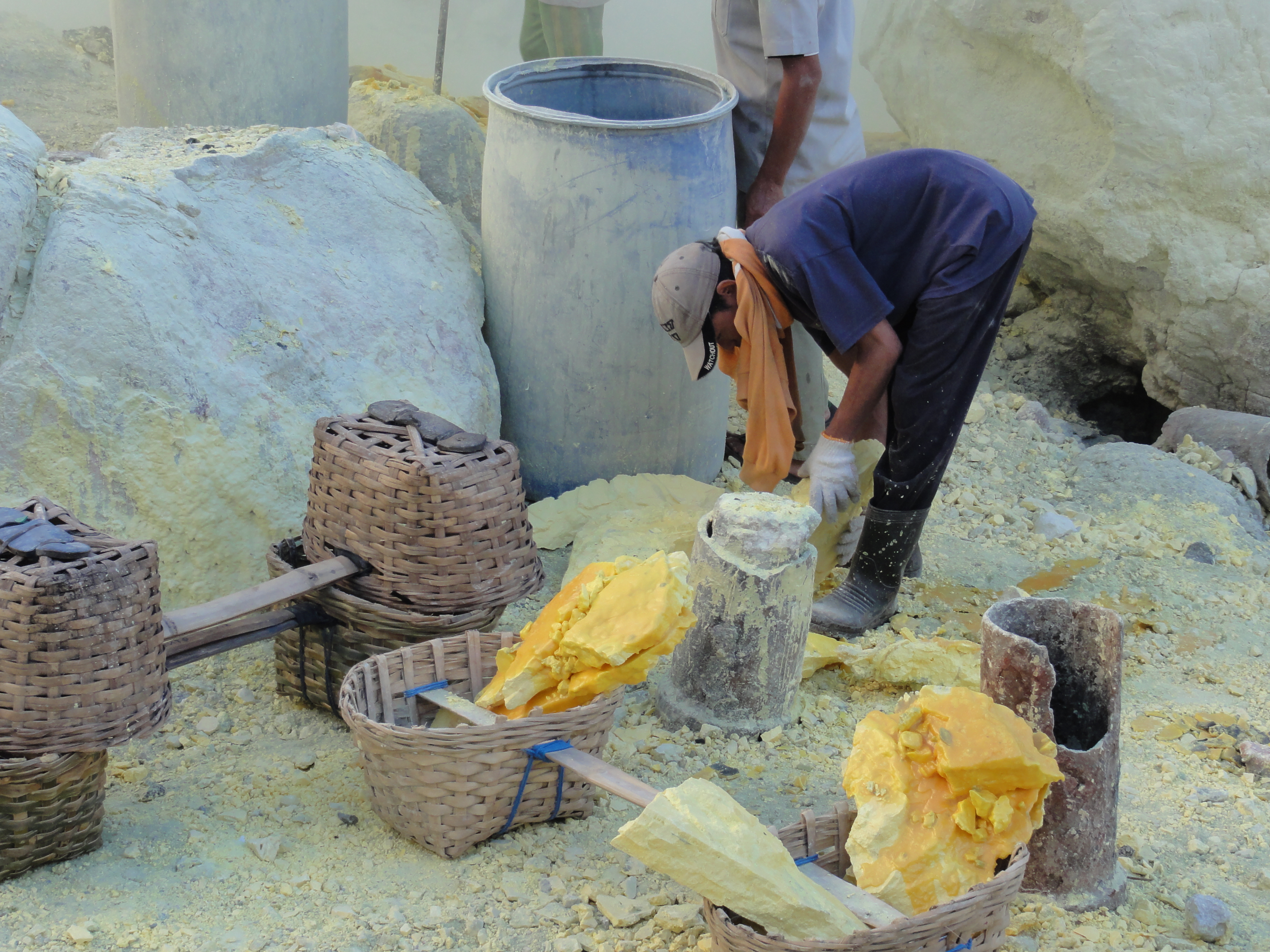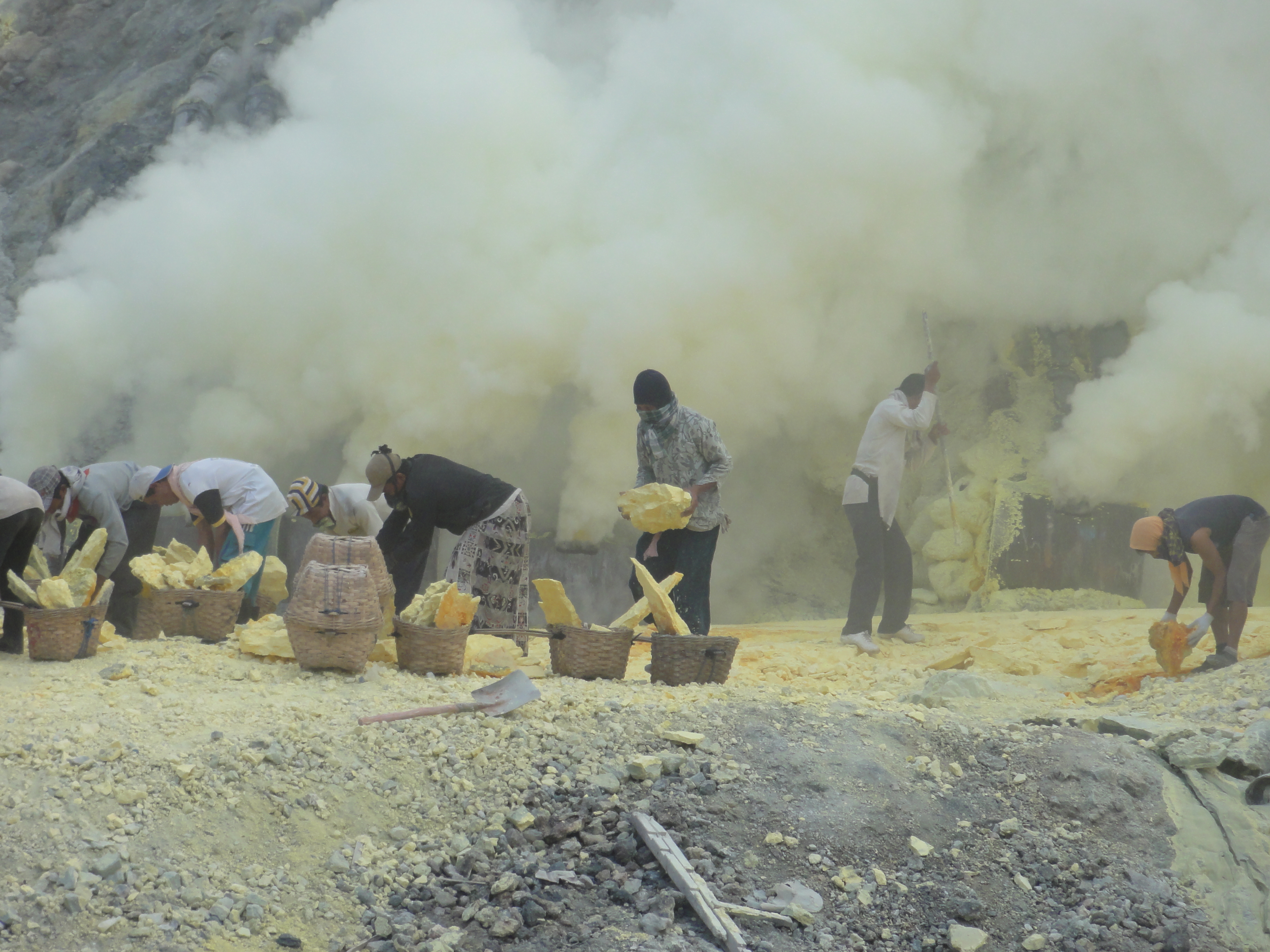 Ils cassent de gros morceaux qu’ils chargent dans leurs 2 paniers. Respect pour ces mineurs qui travaillent plusieurs minutes dans une ambiance irrespirable pour récupérer des gros morceaux de soufre et qui descendent 2 à 3 fois dans la journée dans le cratère dans ces conditions.Aucun masque à gaz efficace, juste de simples chiffons humides sur la bouche et le nez.