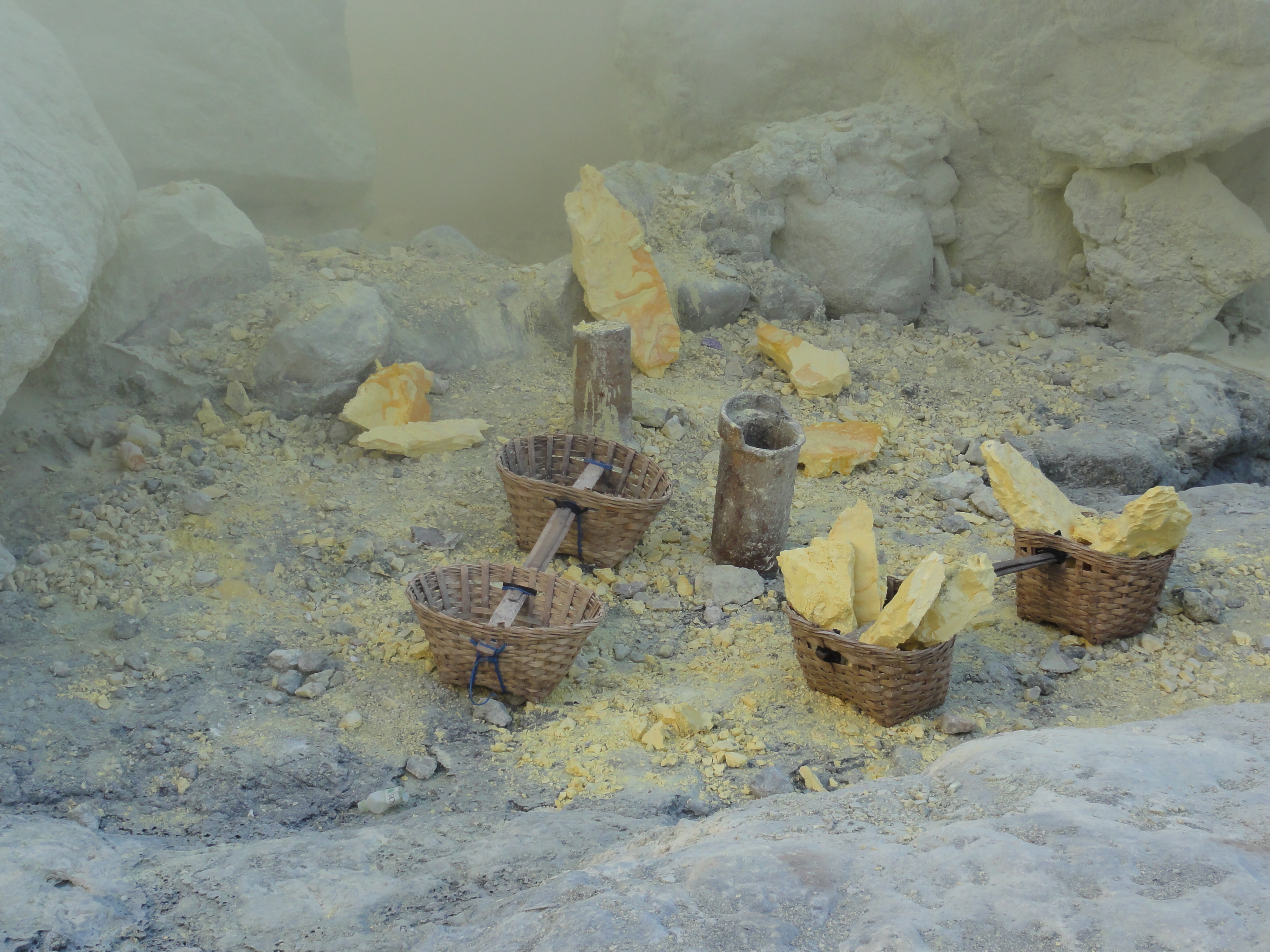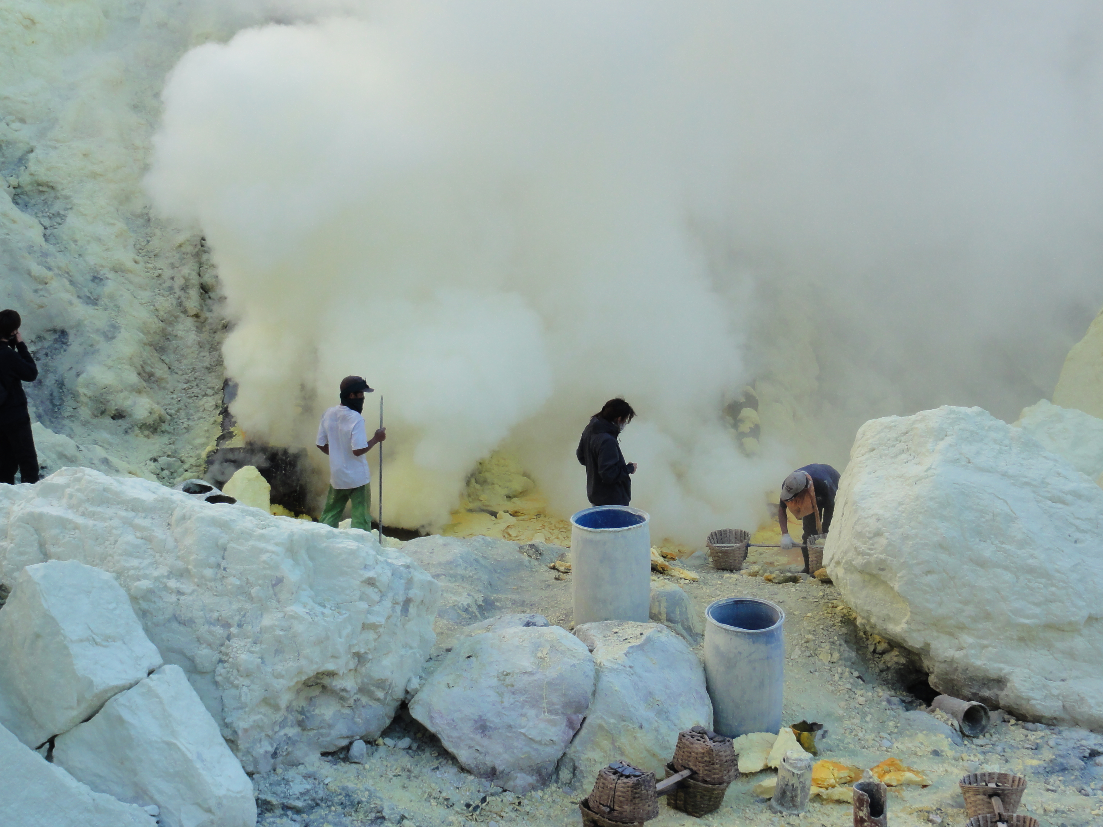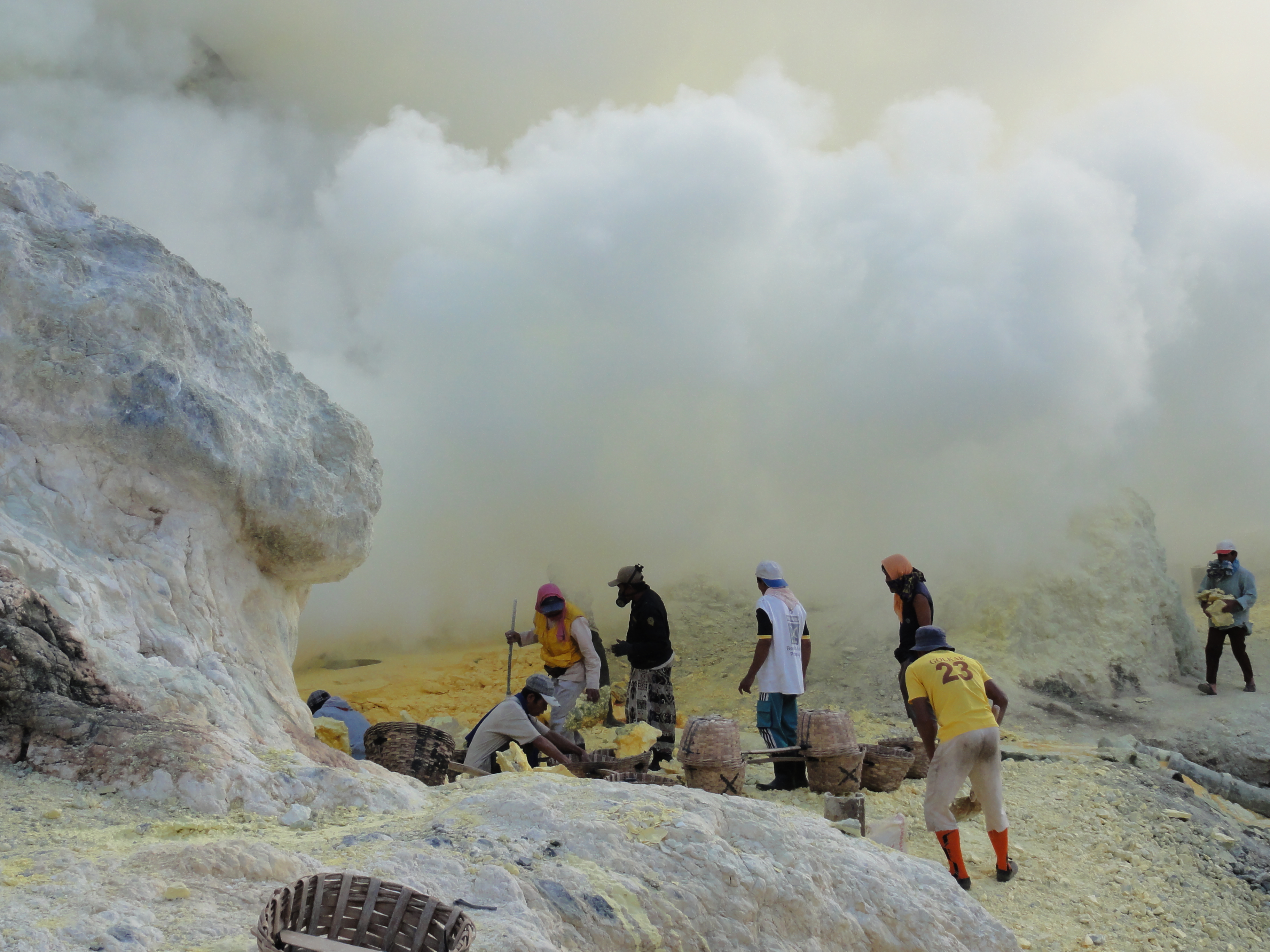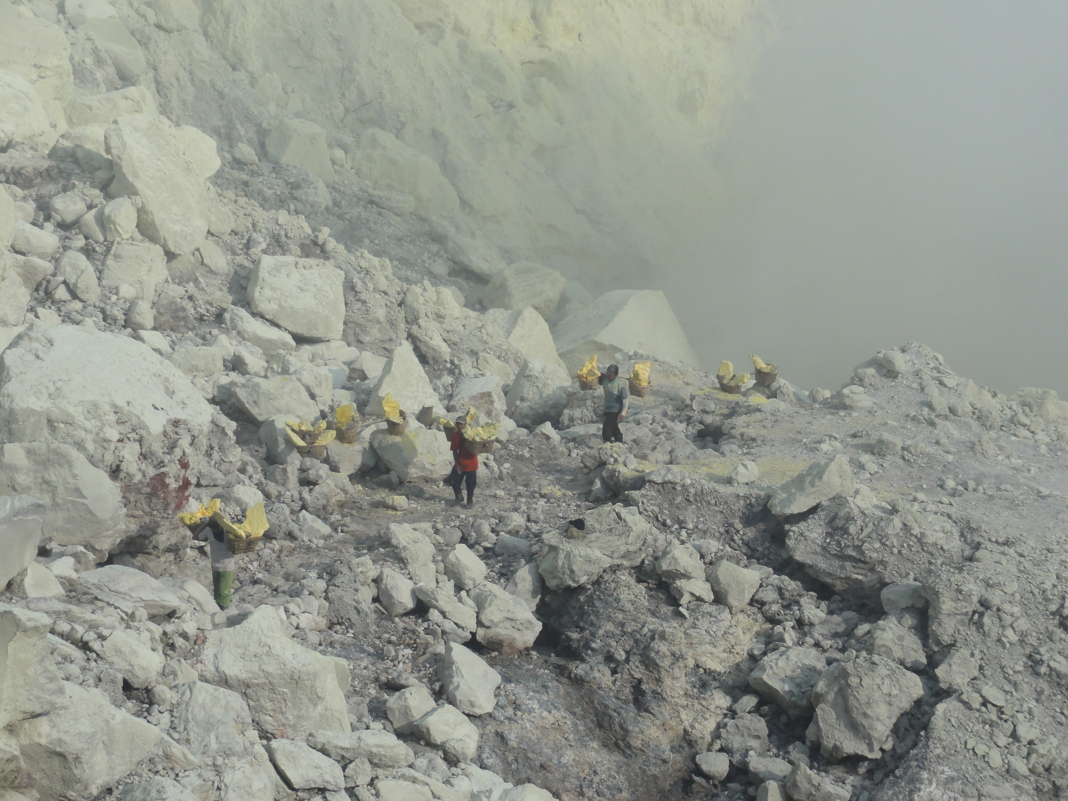 Ils cassent de gros morceaux qu’ils chargent dans leurs 2 paniers. Respect pour ces mineurs qui travaillent plusieurs minutes dans une ambiance irrespirable pour récupérer des gros morceaux de soufre et qui descendent 2 à 3 fois dans la journée dans le cratère dans ces conditions.Aucun masque à gaz efficace, juste de simples chiffons humides sur la bouche et le nez.