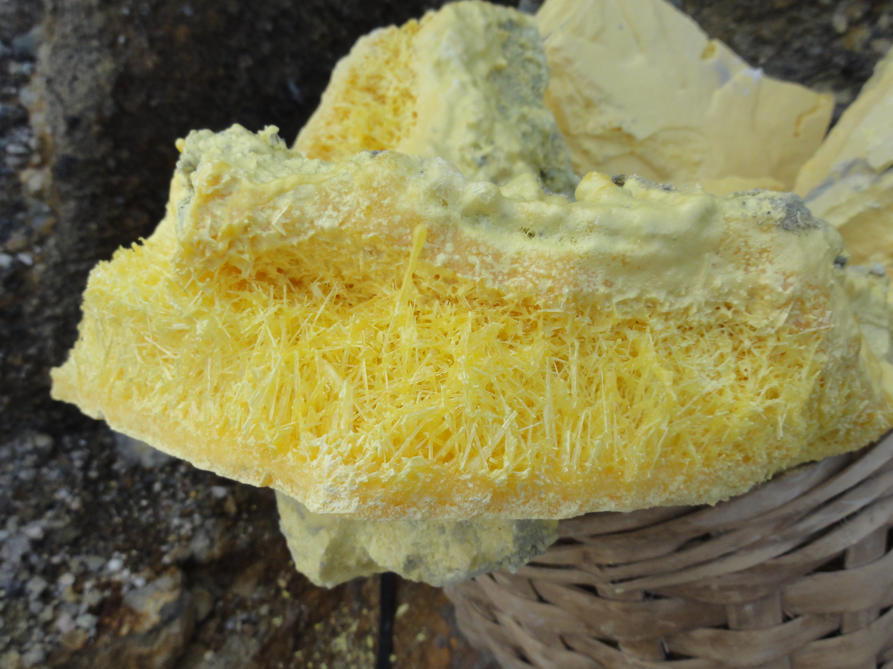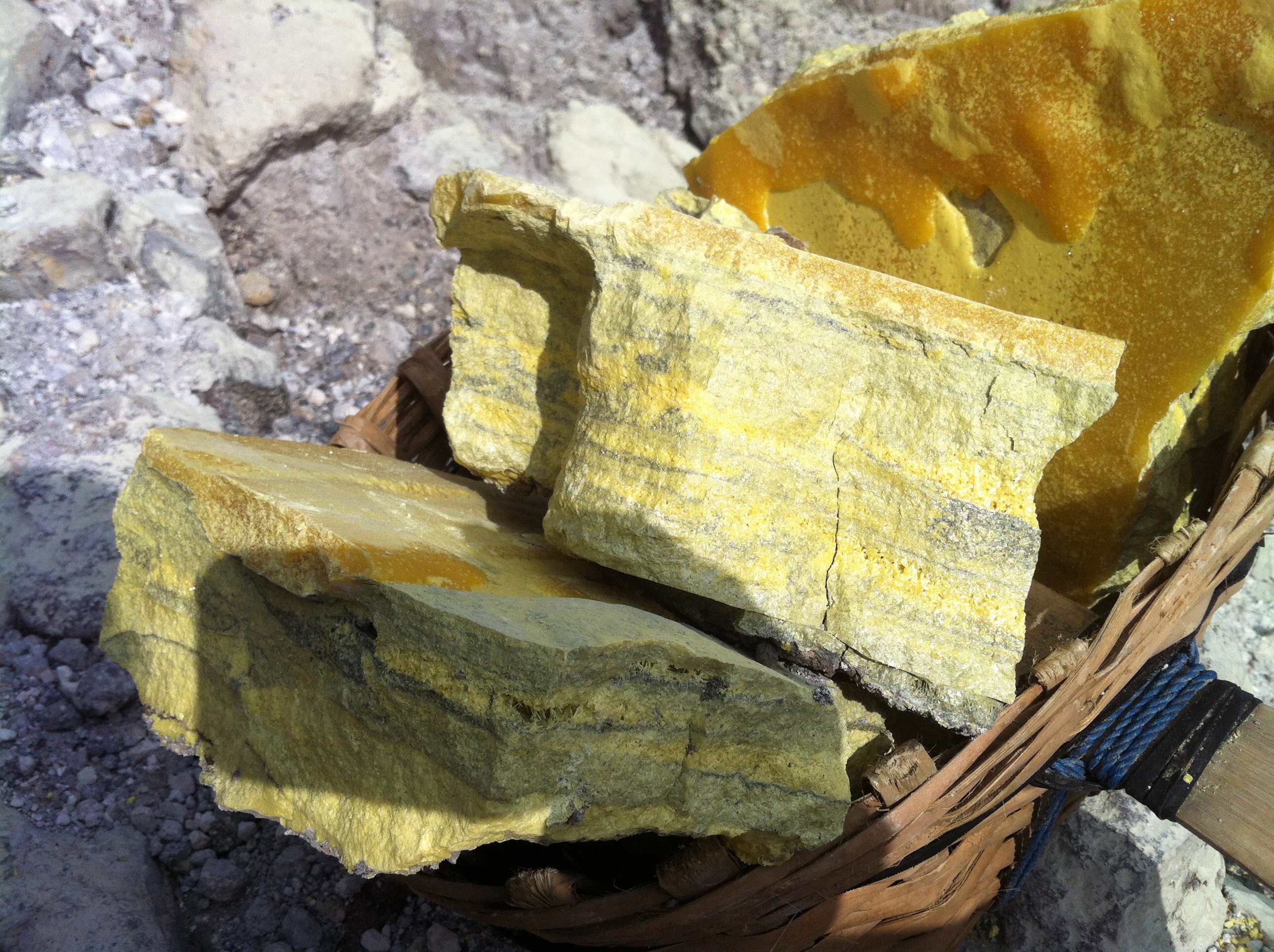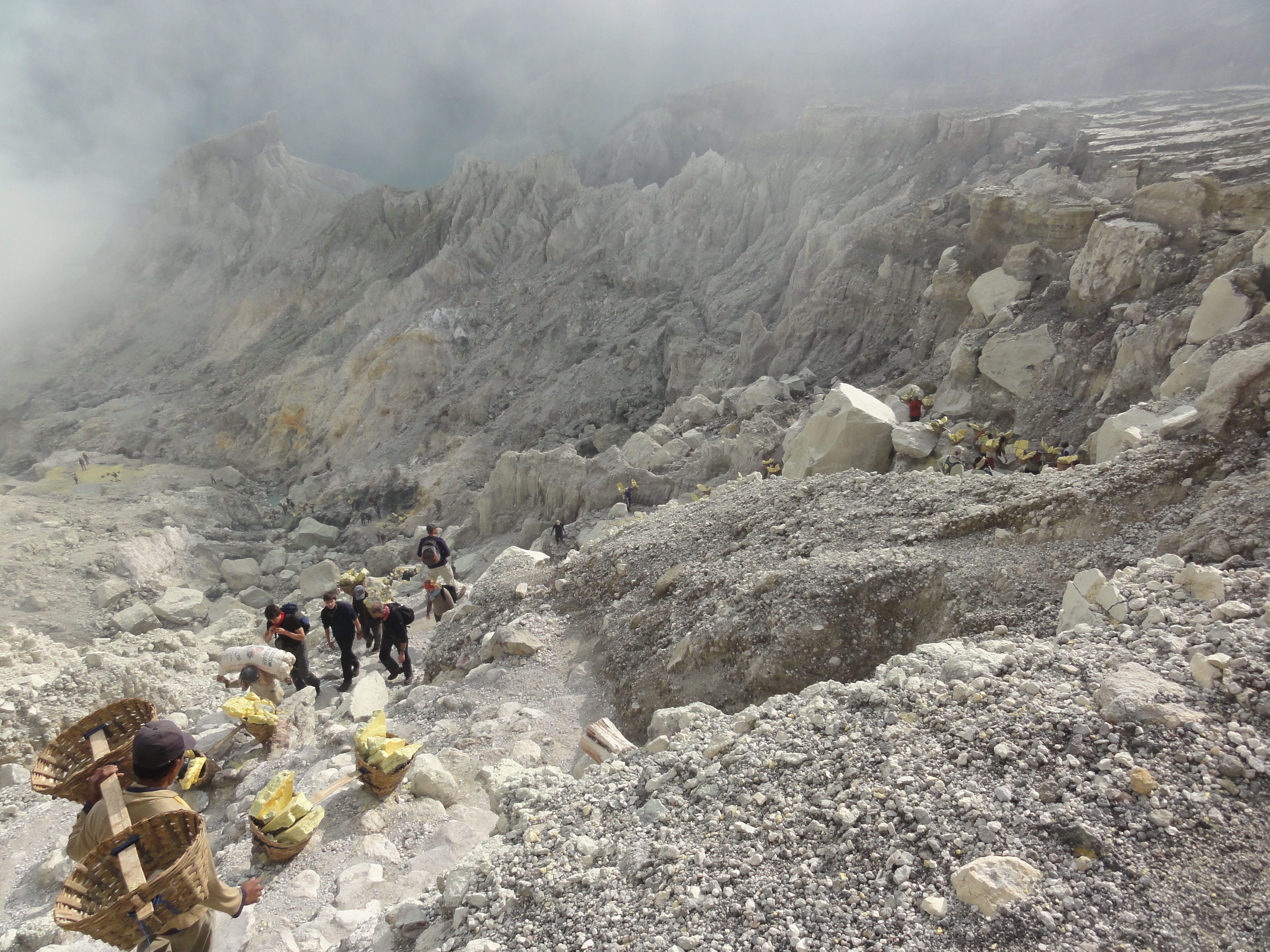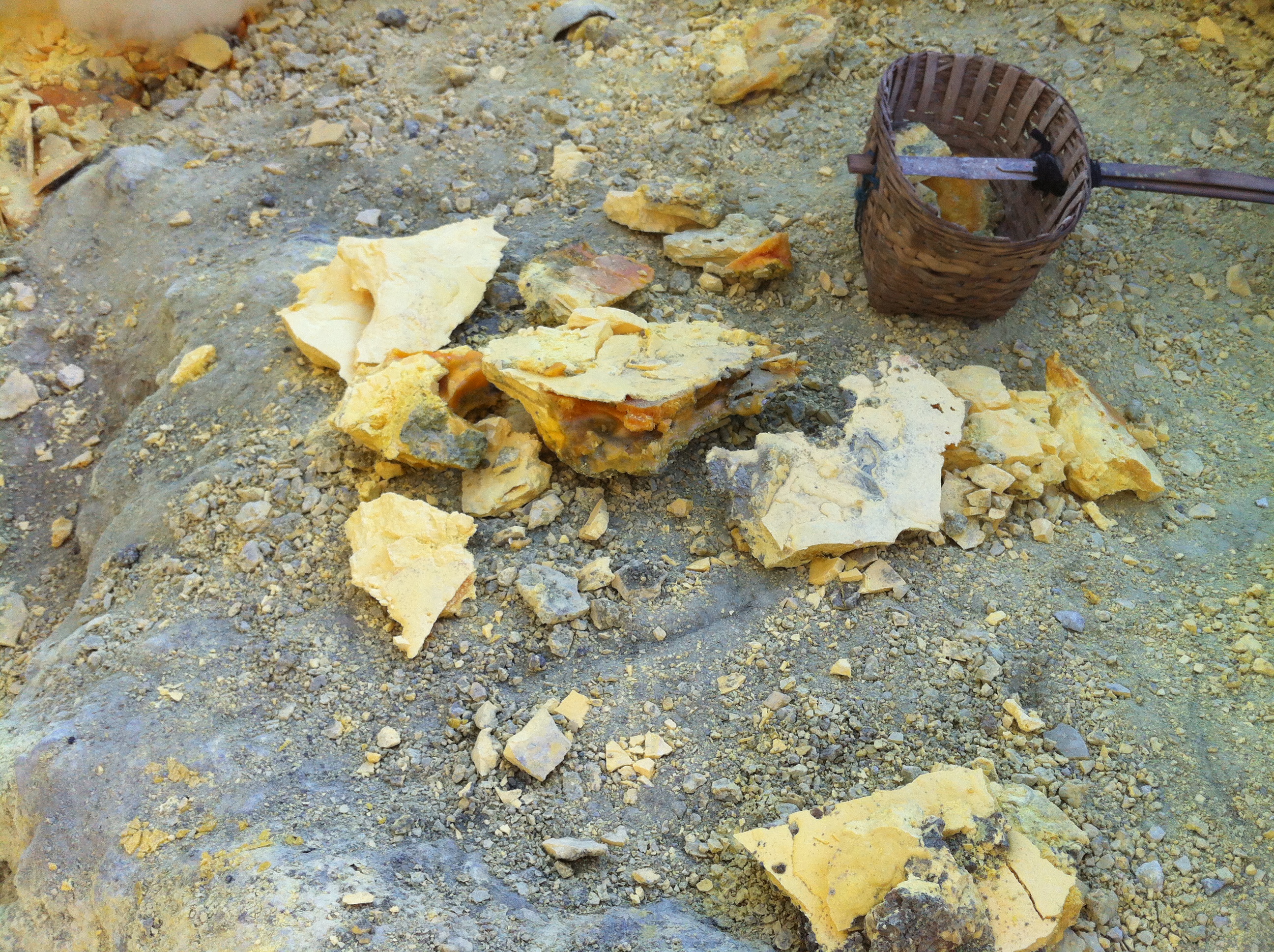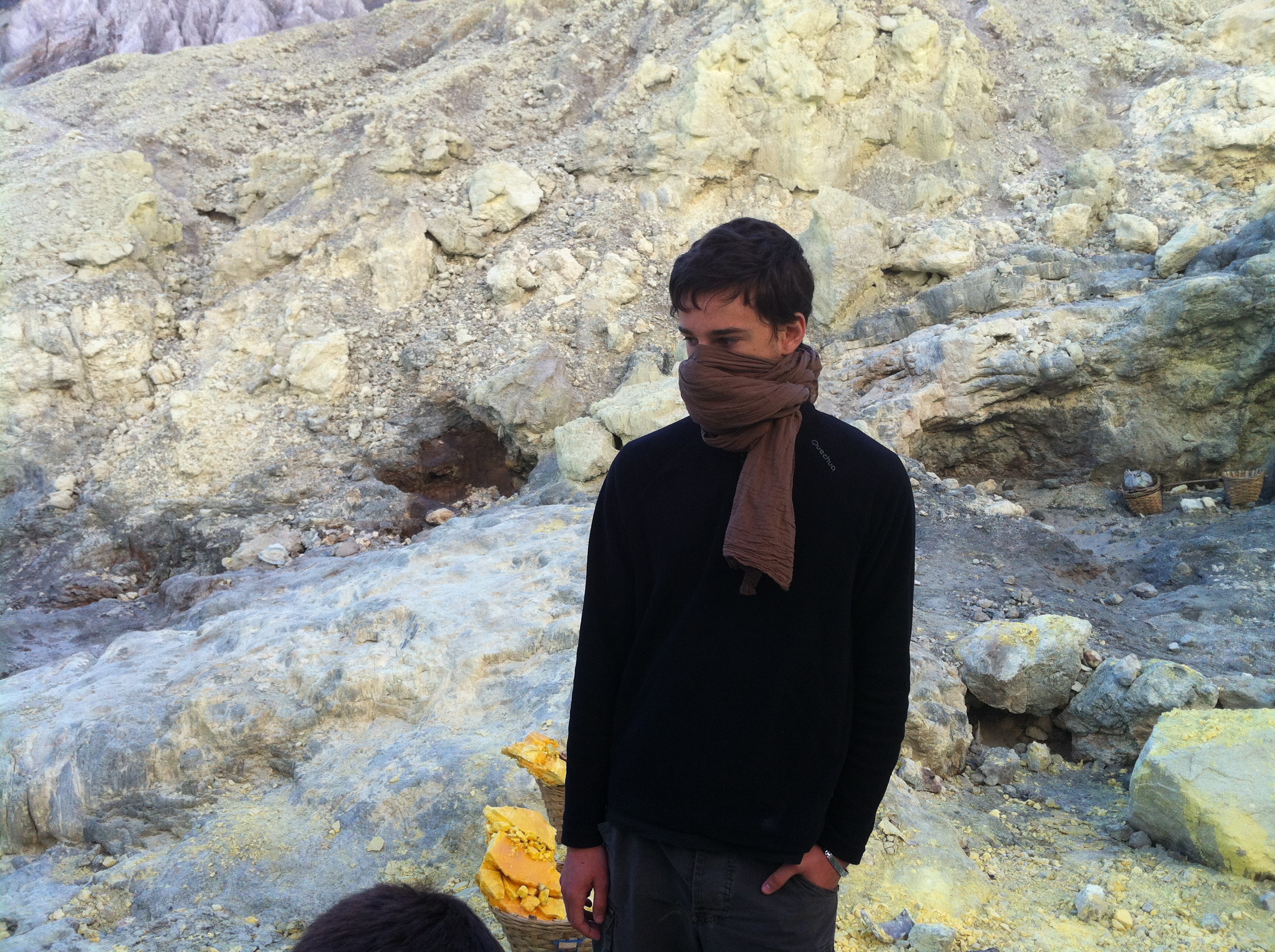 Ils cassent de gros morceaux qu’ils chargent dans leurs 2 paniers. Respect pour ces mineurs qui travaillent plusieurs minutes dans une ambiance irrespirable pour récupérer des gros morceaux de soufre et qui descendent 2 à 3 fois dans la journée dans le cratère dans ces conditions.Aucun masque à gaz efficace, juste de simples chiffons humides sur la bouche et le nez.