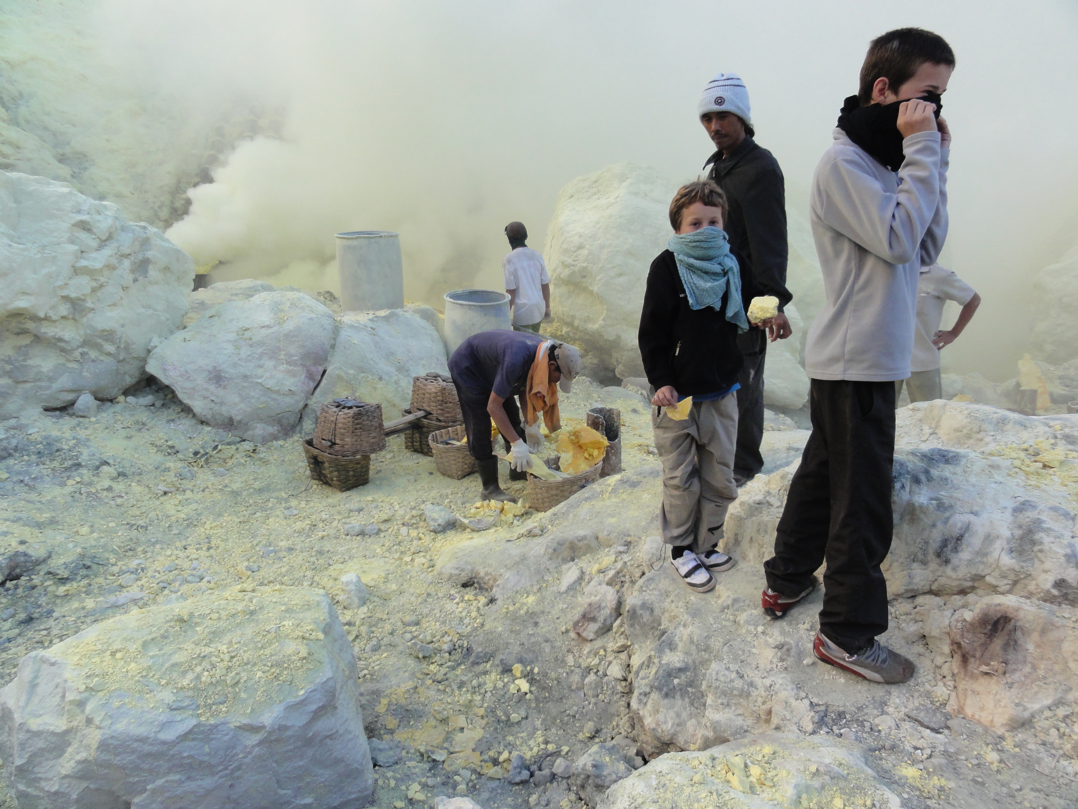 Du fait des vapeurs de soufre, seuls les 4 garçons descendent dans le cratère en compagnie des porteurs de soufre.