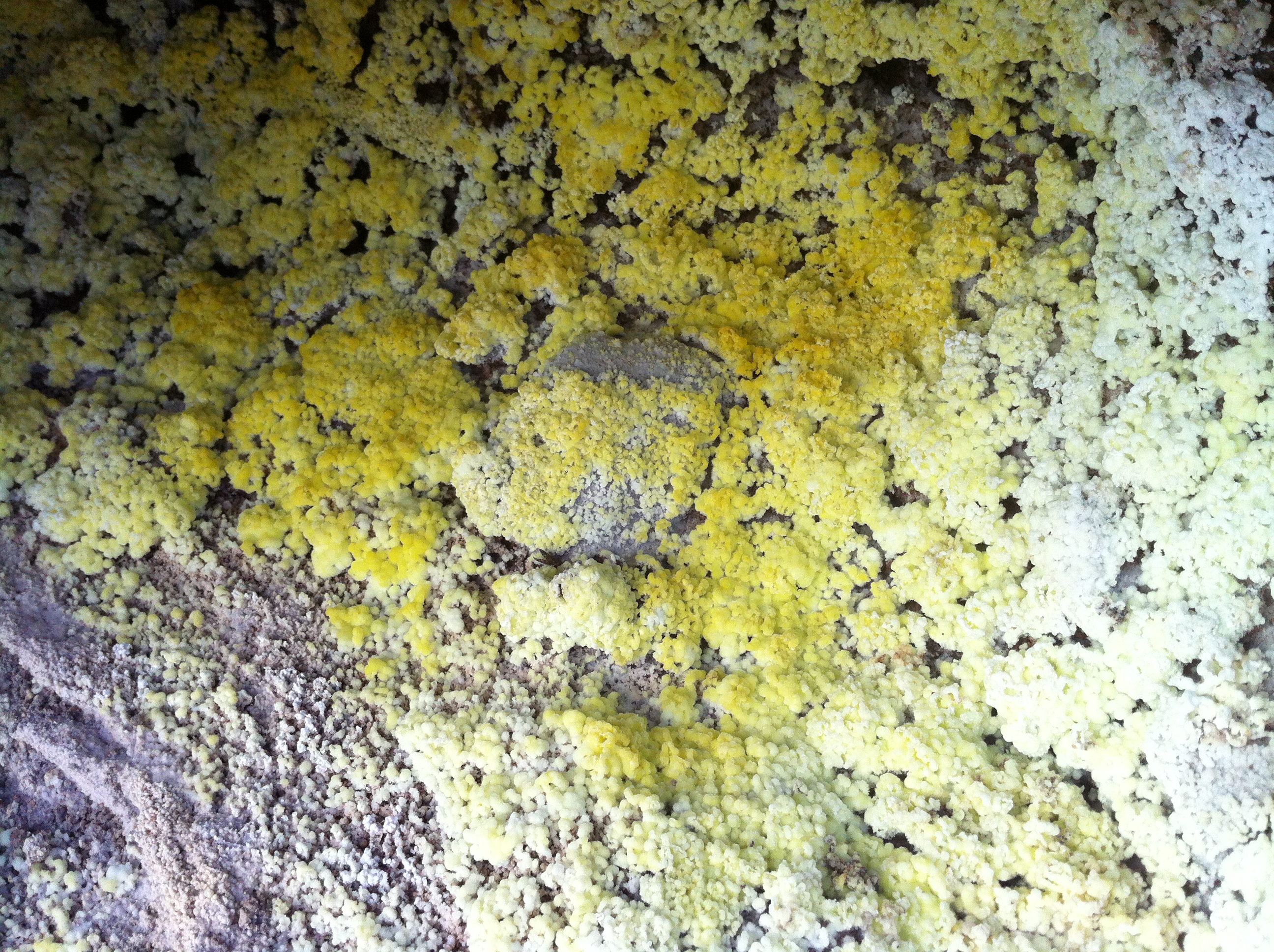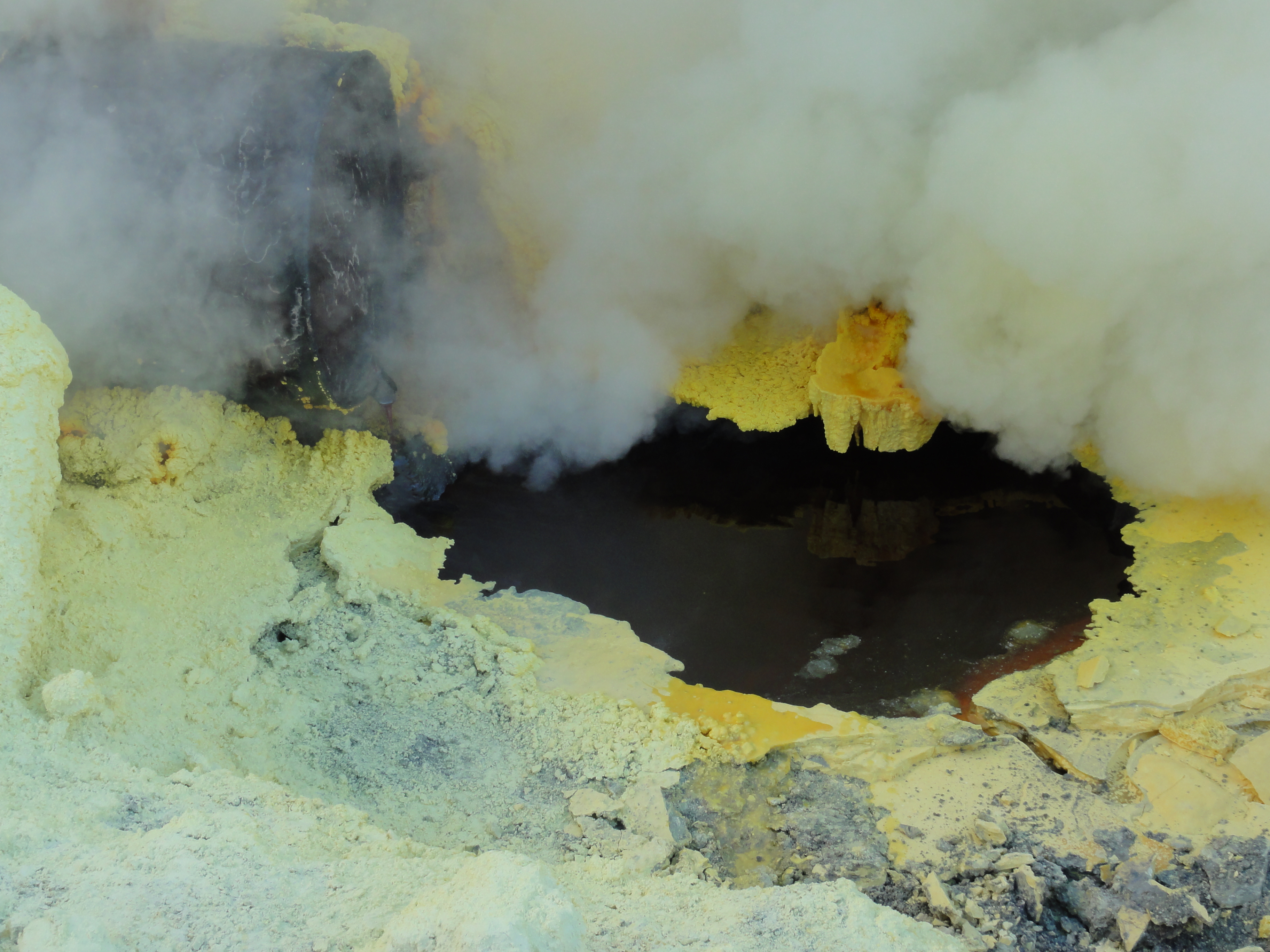 Le soufre est visible sous différentes formes, liquide, solide, en dépôt, en concrétions.