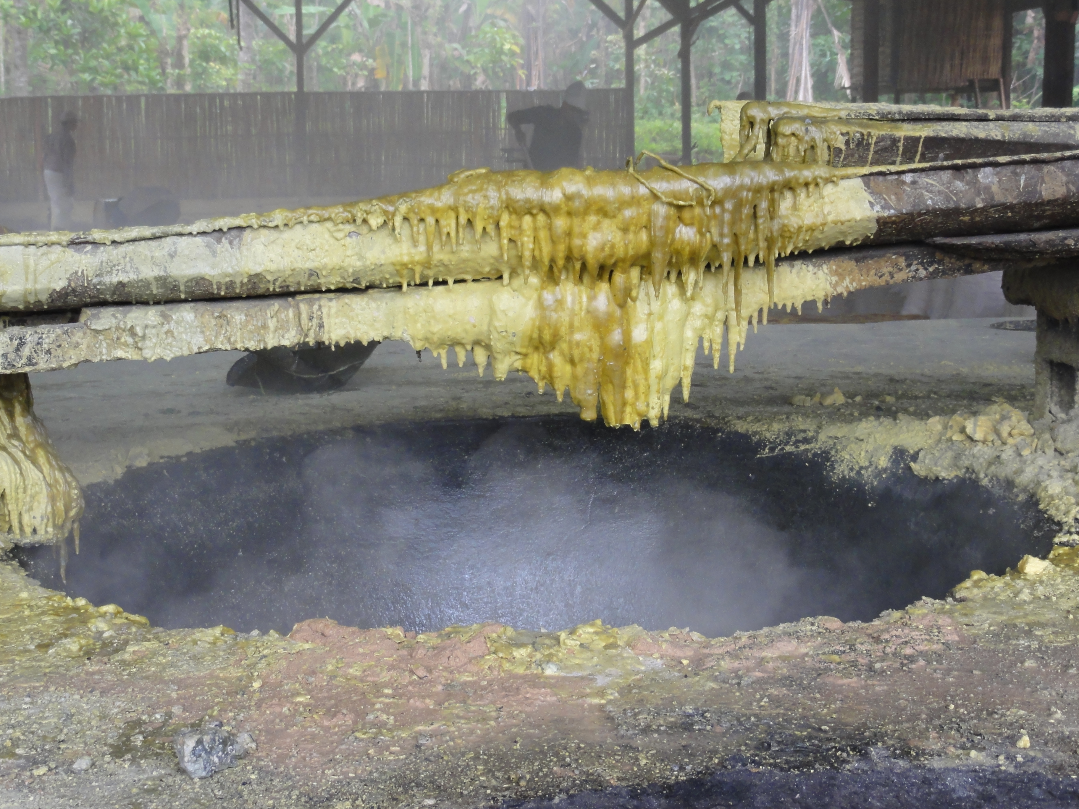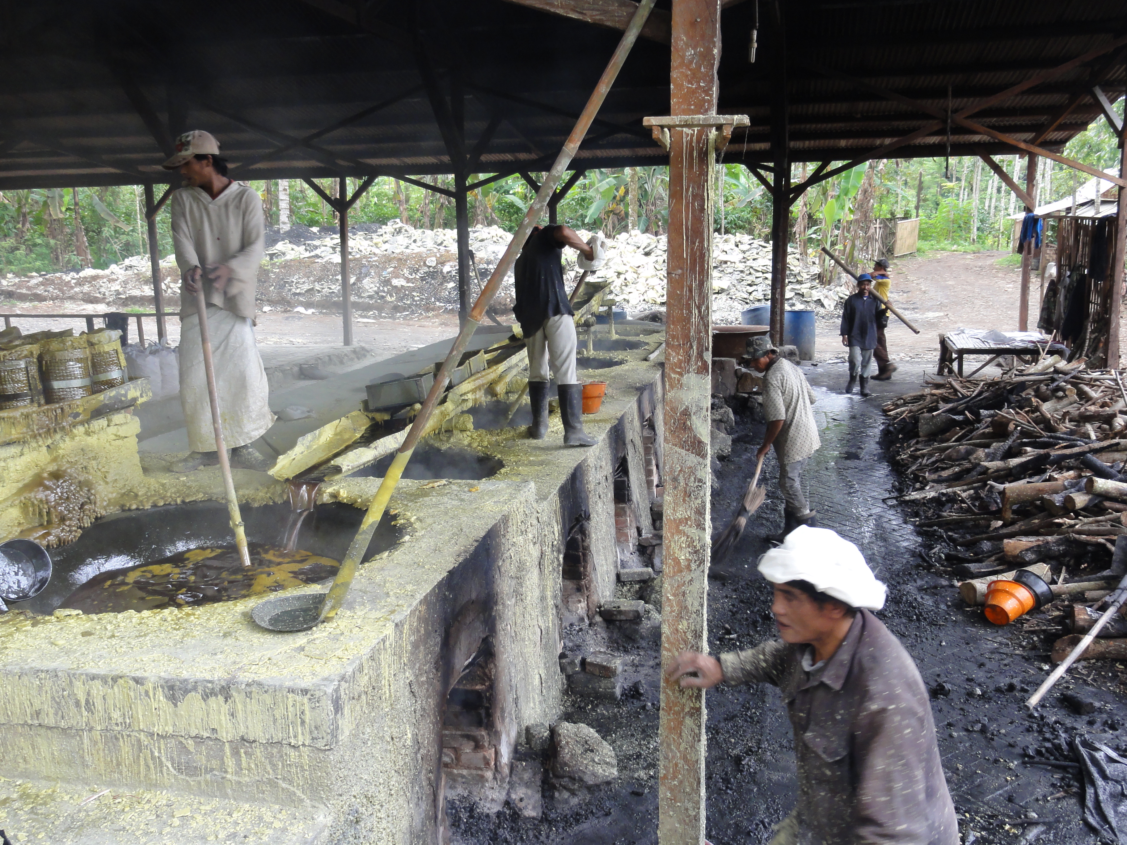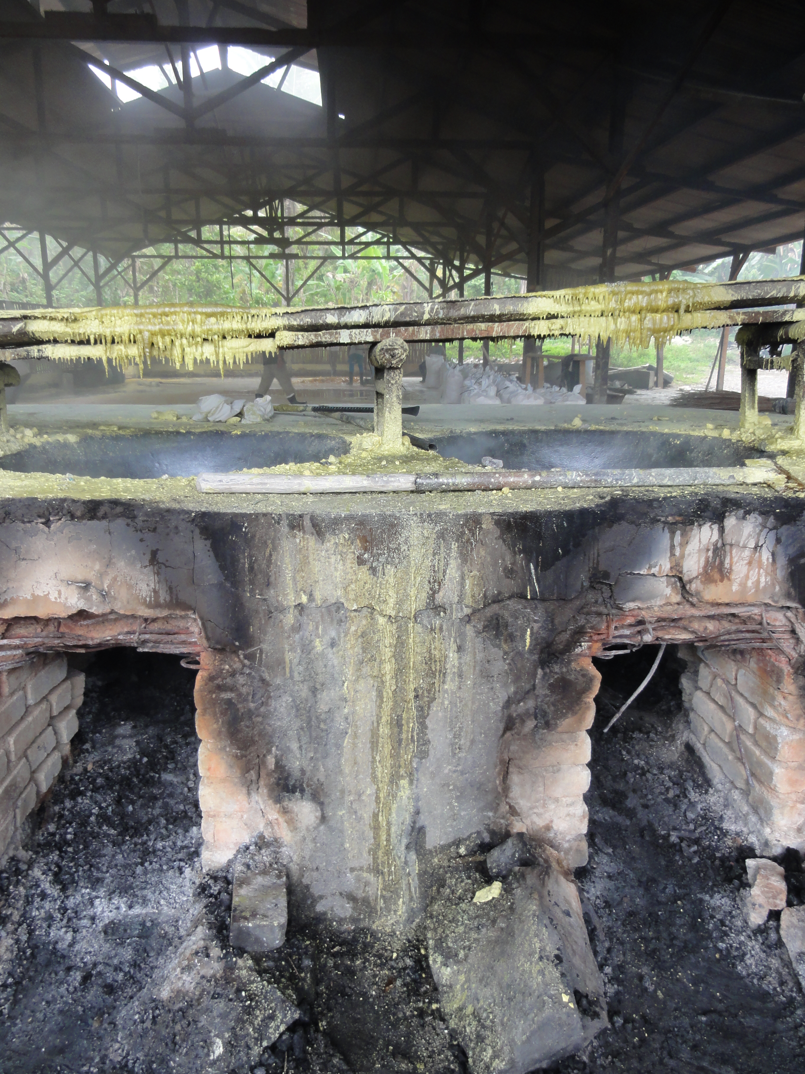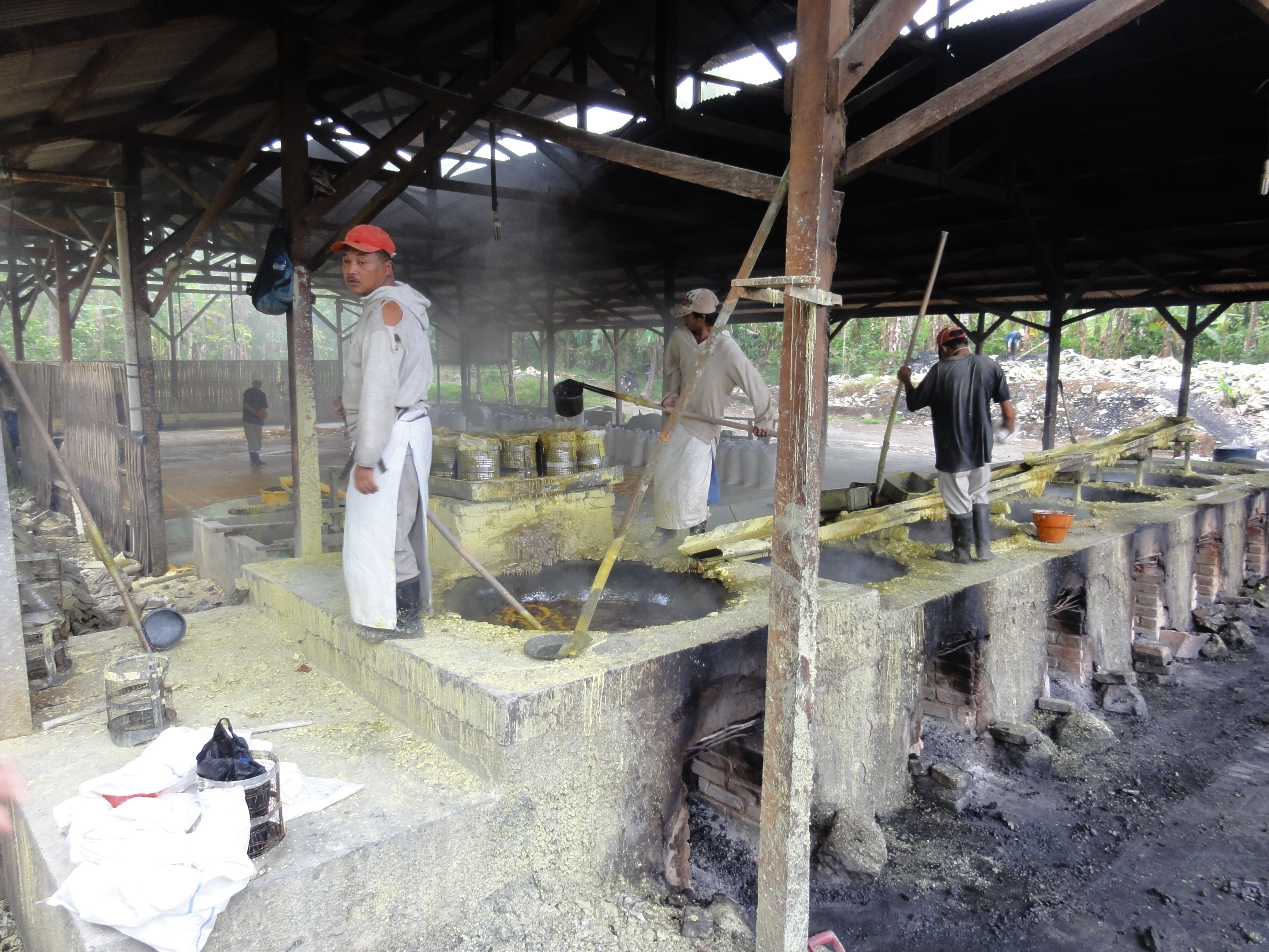De retour au village vers 11h, nous dévorons un repas bien mérité puis une petite sieste. Au réveil, nous allons visiter l’usine de transformation du soufre. L’usine et là avec les ouvriers qui travaillent dans des conditions très difficiles, chaleur et vapeurs de soufre intenses. Ils fondent le soufre.