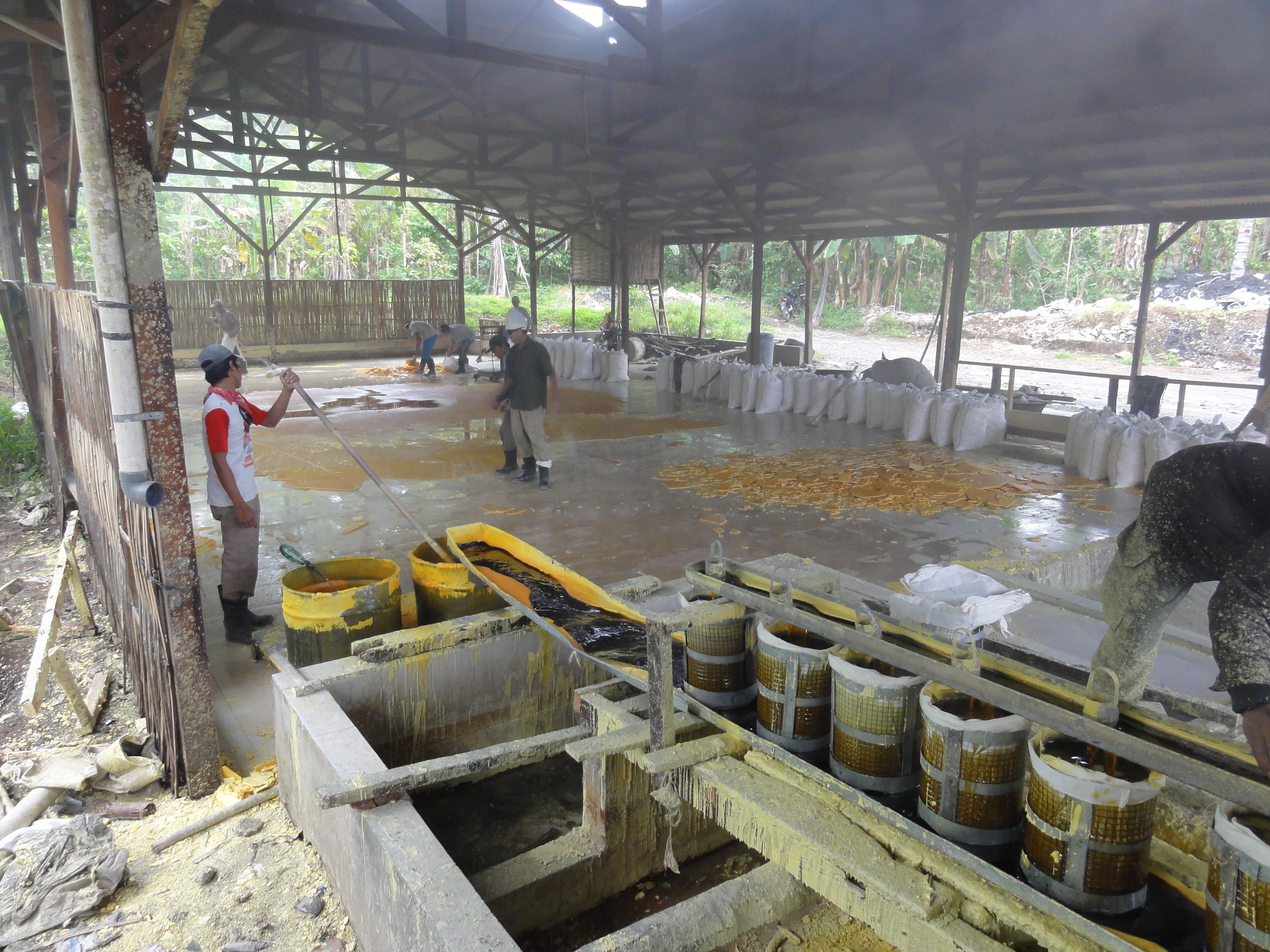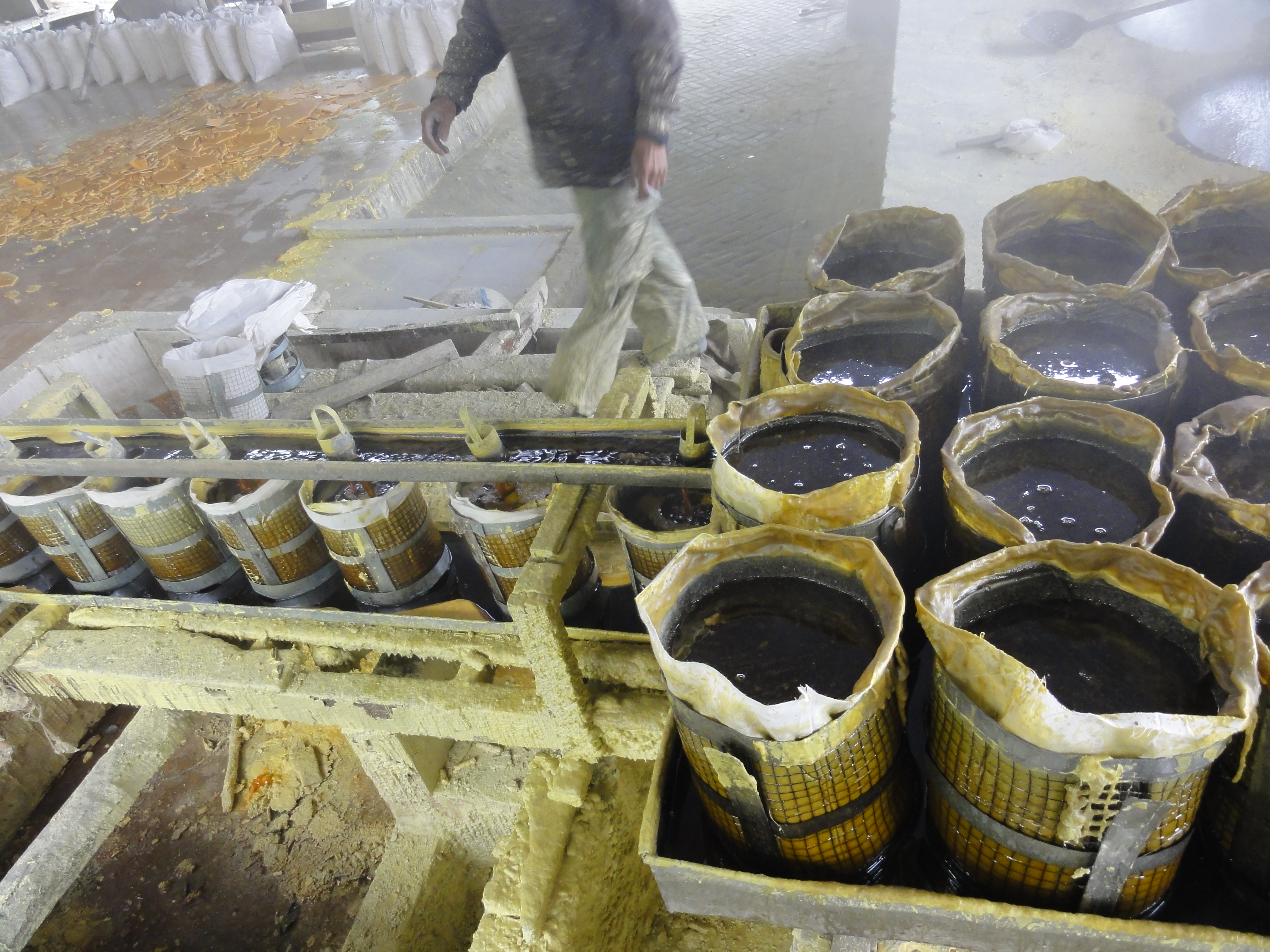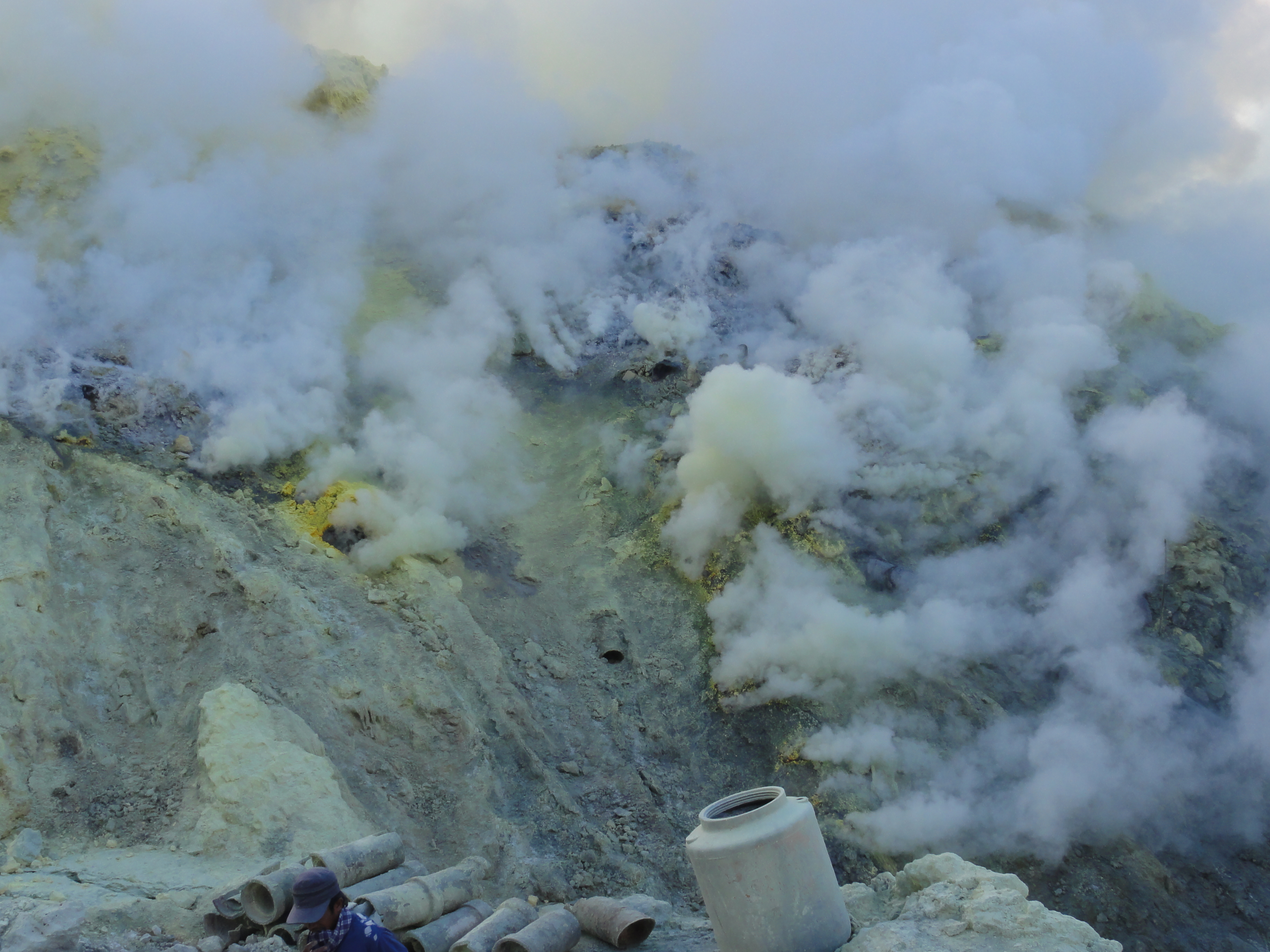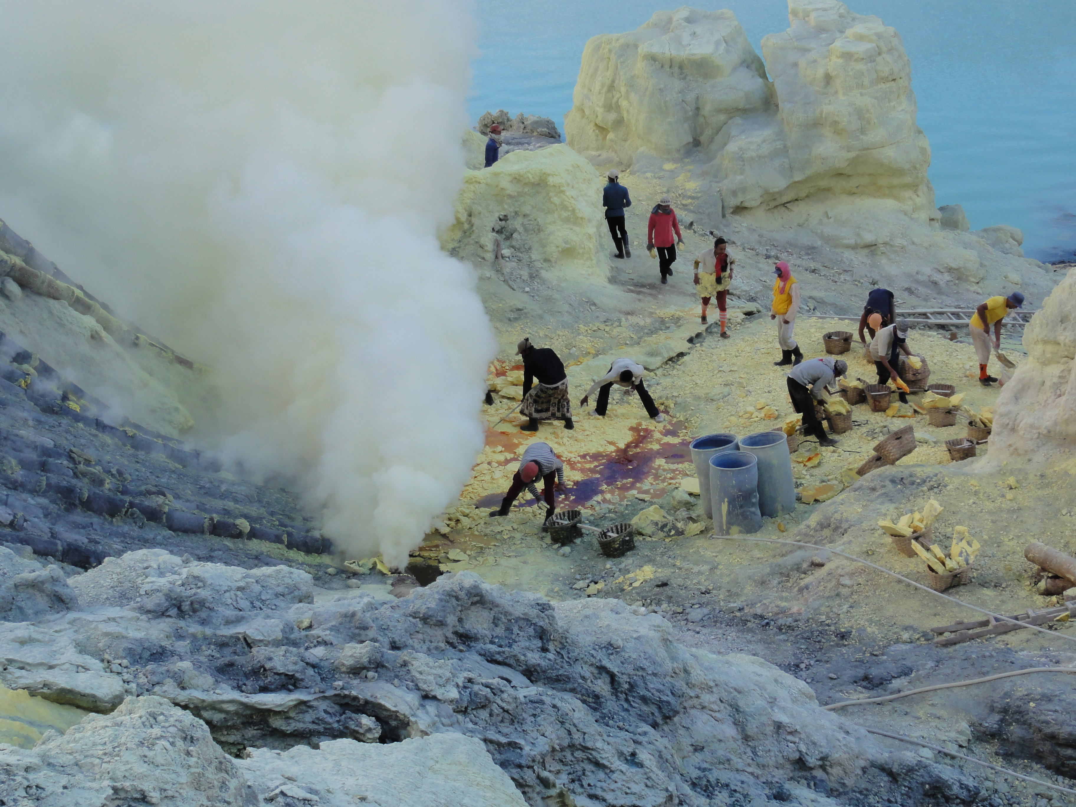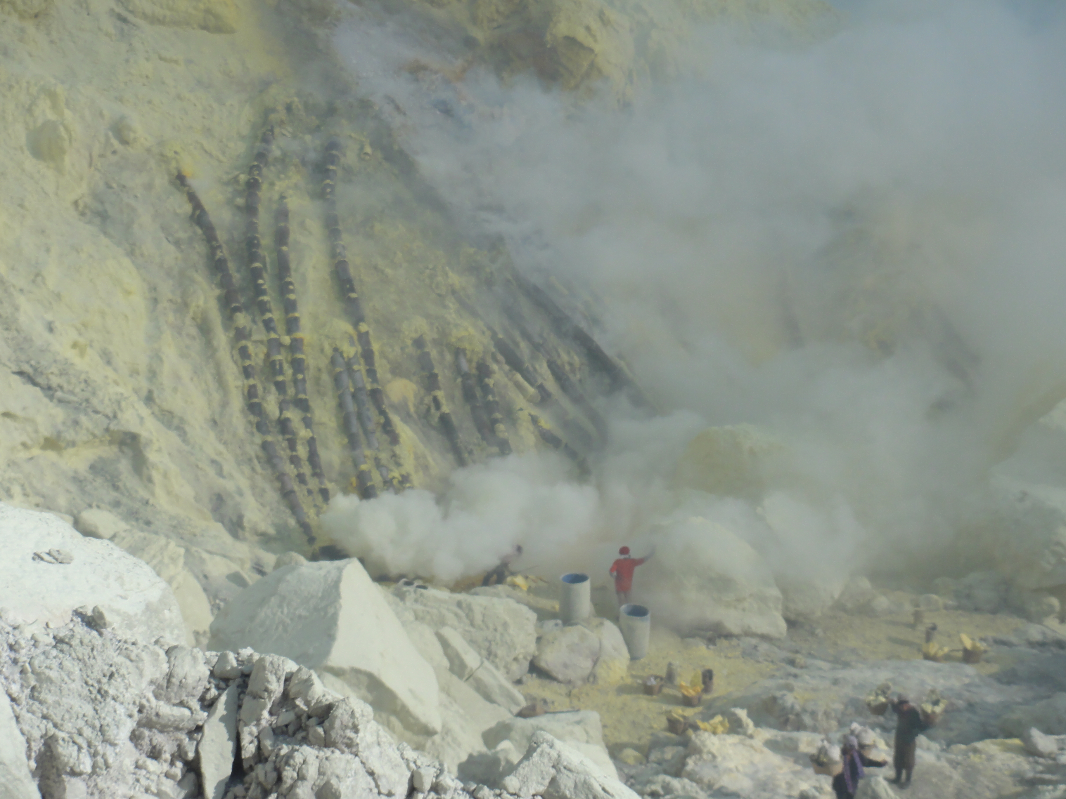 De retour au village vers 11h, nous dévorons un repas bien mérité puis une petite sieste. Au réveil, nous allons visiter l’usine de transformation du soufre. L’usine et là avec les ouvriers qui travaillent dans des conditions très difficiles, chaleur et vapeurs de soufre intenses. Ils fondent le soufre.
