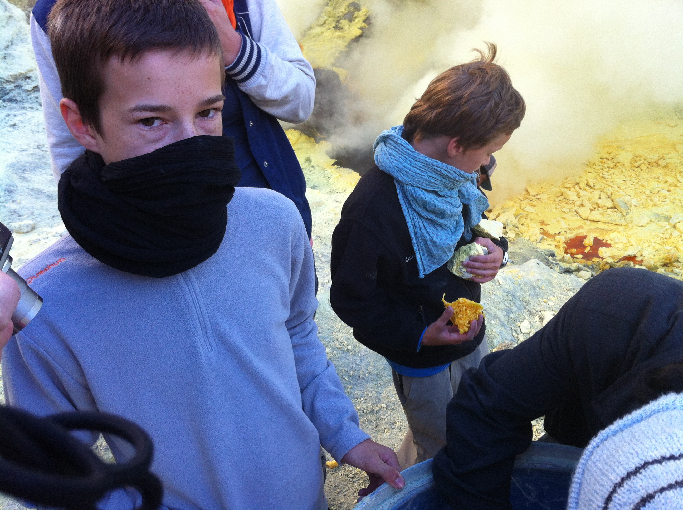 Pierre-Jean et les enfants abandonnent rapidement à cause du vent qui tourne et des fumées qui envahissent le cratère. Pas agréable du tout, impression de suffocation et forte irritation de la gorge et du nez malgré la protection avec des foulards humides.