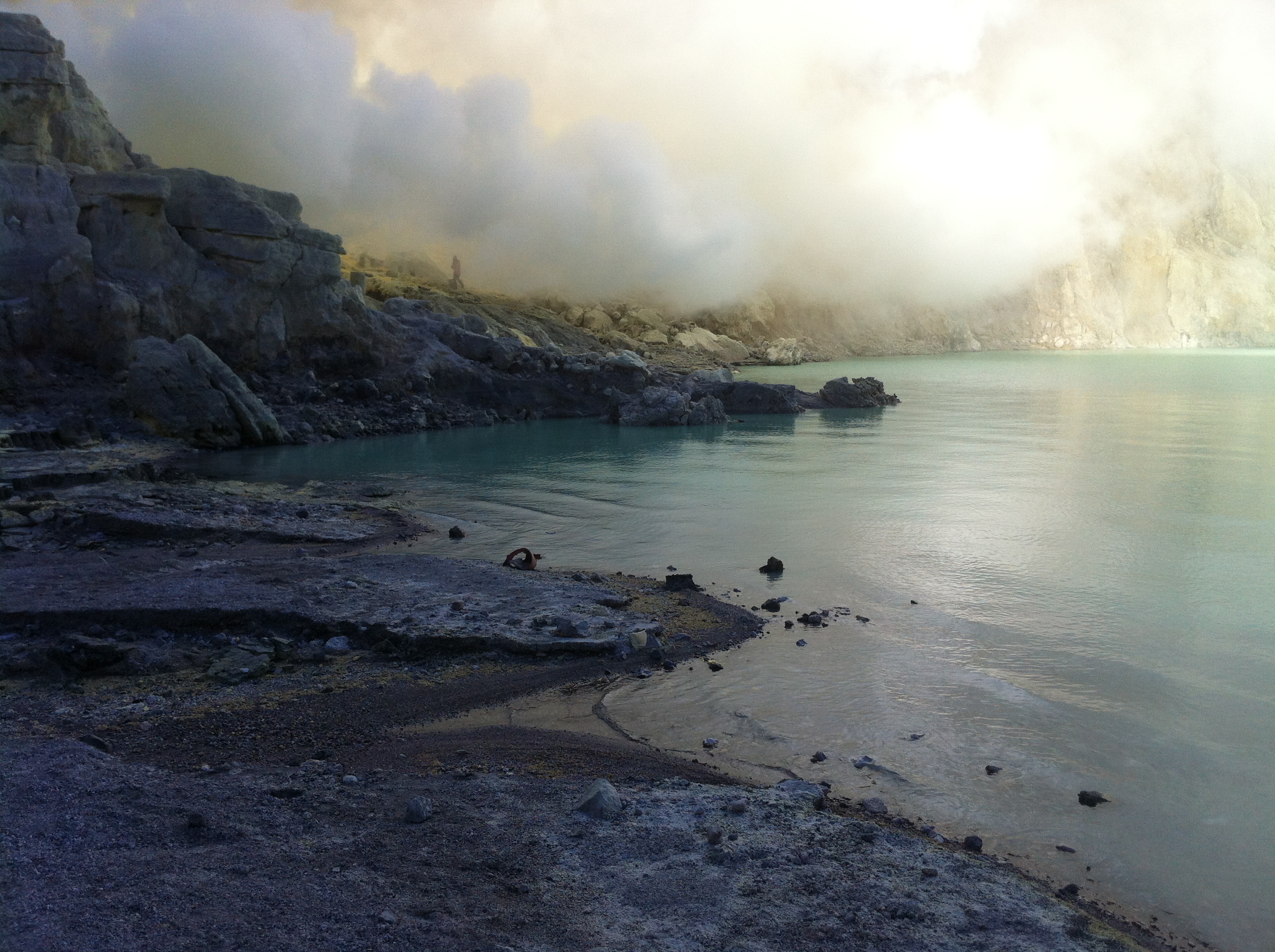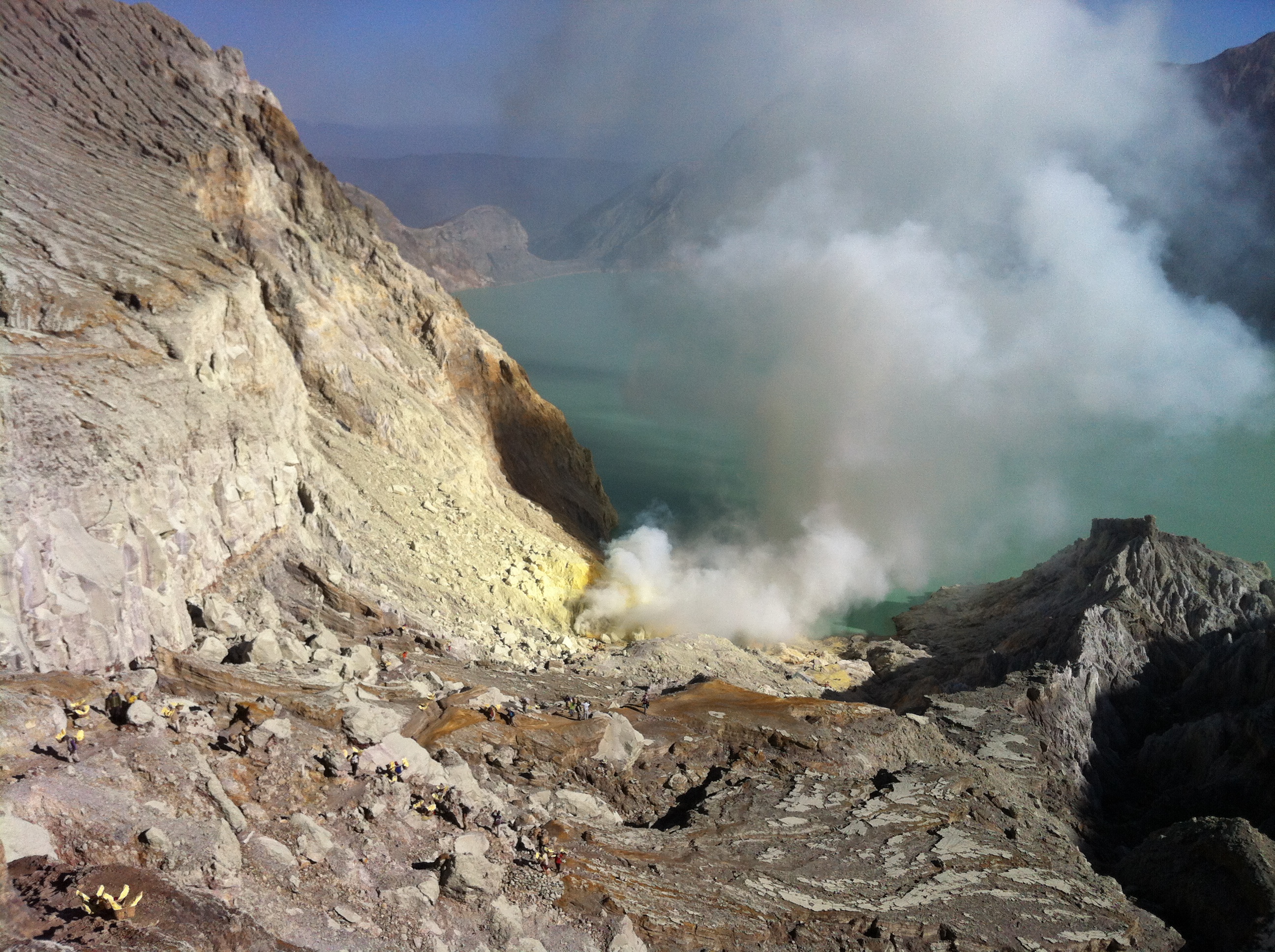 La mine de soufre au bord du lac et perdue dans les vapeurs est impressionnante.