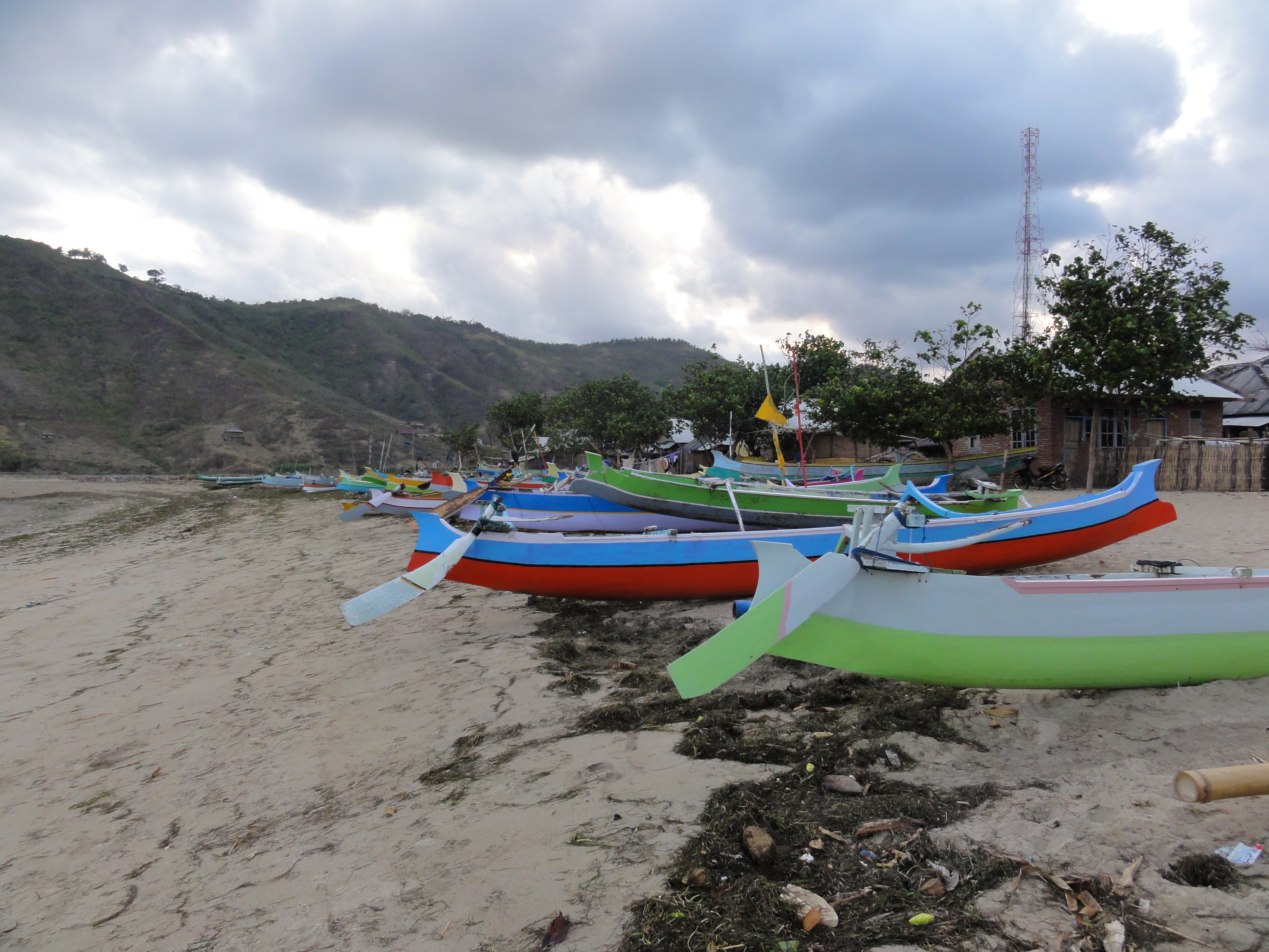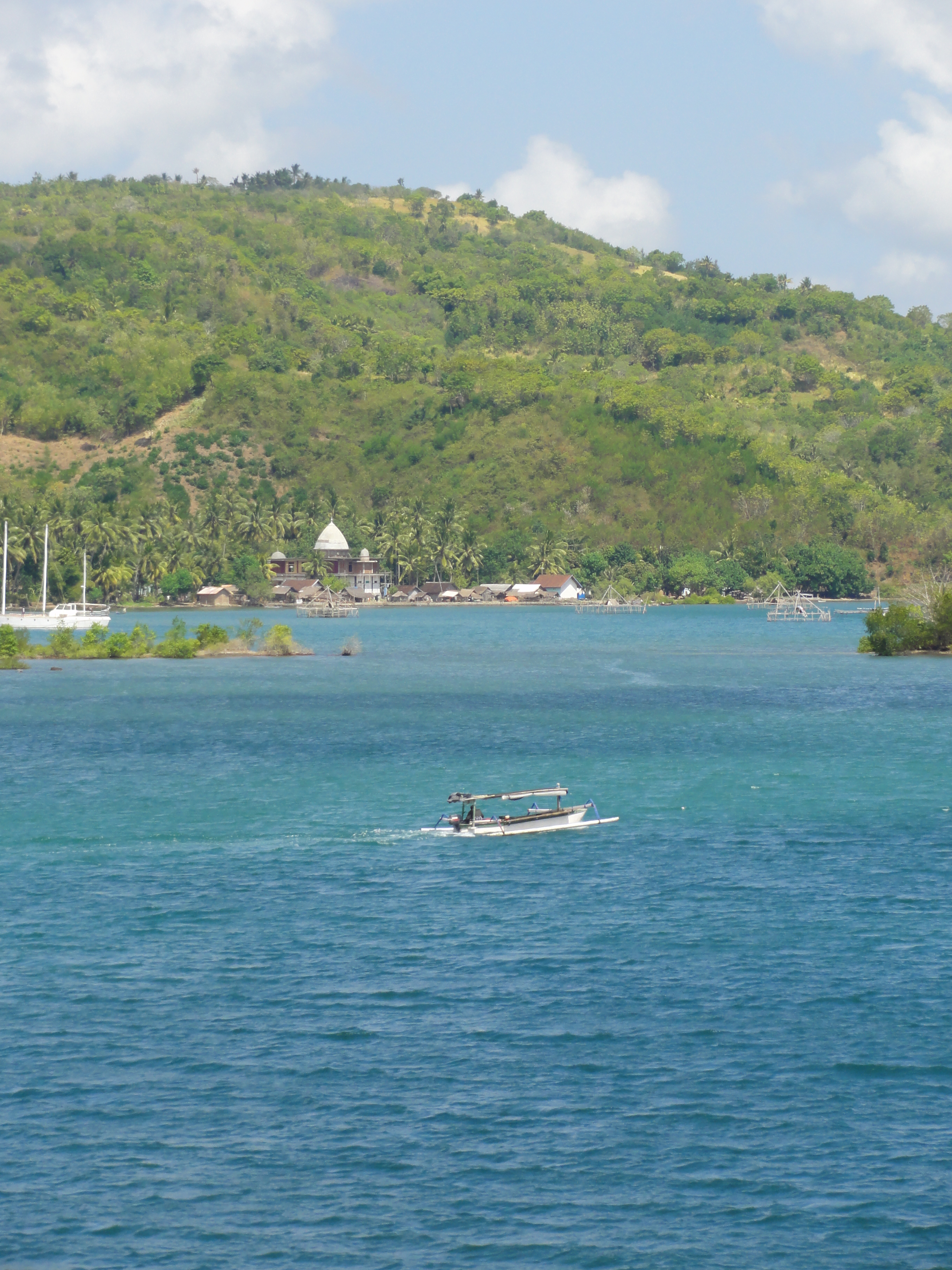 Arrivés au port de Lembar, nous devons patienter 1h le temps qu’un quai se libère. Nous nous faisons aborder par des petits bateaux de pêcheurs avec son lot de vendeurs de nourriture (riz, poulet, fruits)….