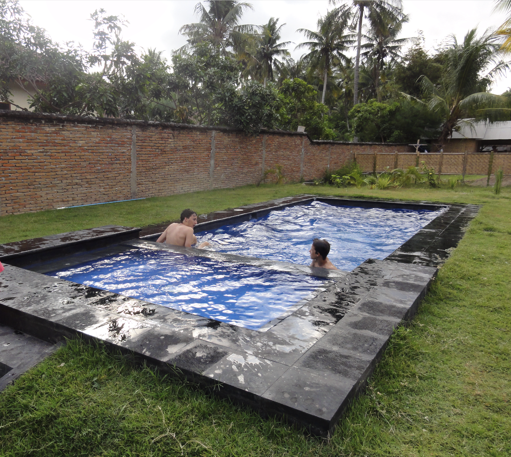 Nous nous éclatons dans la piscine, nous sommes complètement seuls dans l’hôtel. 2 jeunes du staff viennent se joindre à nous et sympathisent un peu avec les garçons.