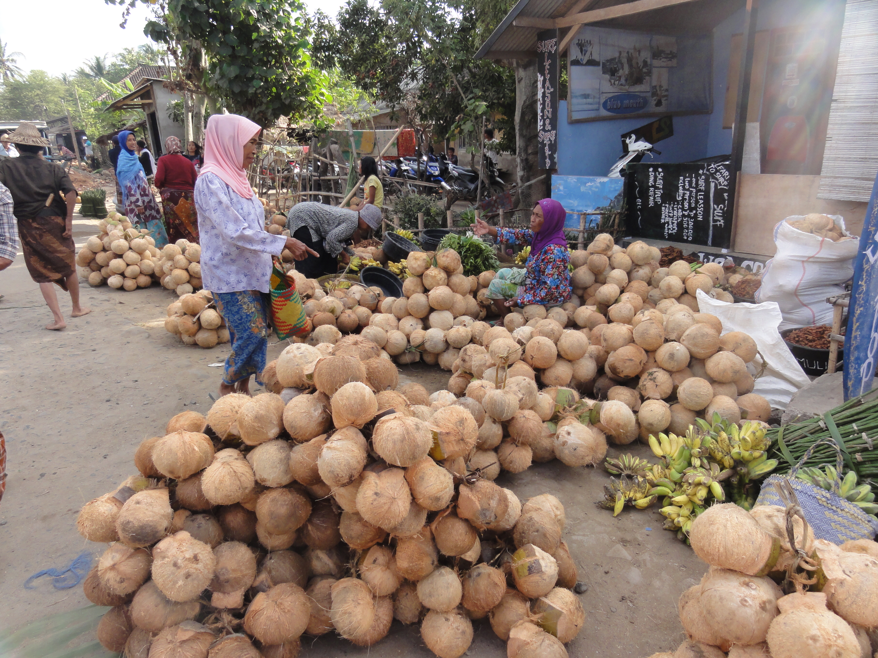 Des étals très variés, des noix de coco, des fruits de légumes…