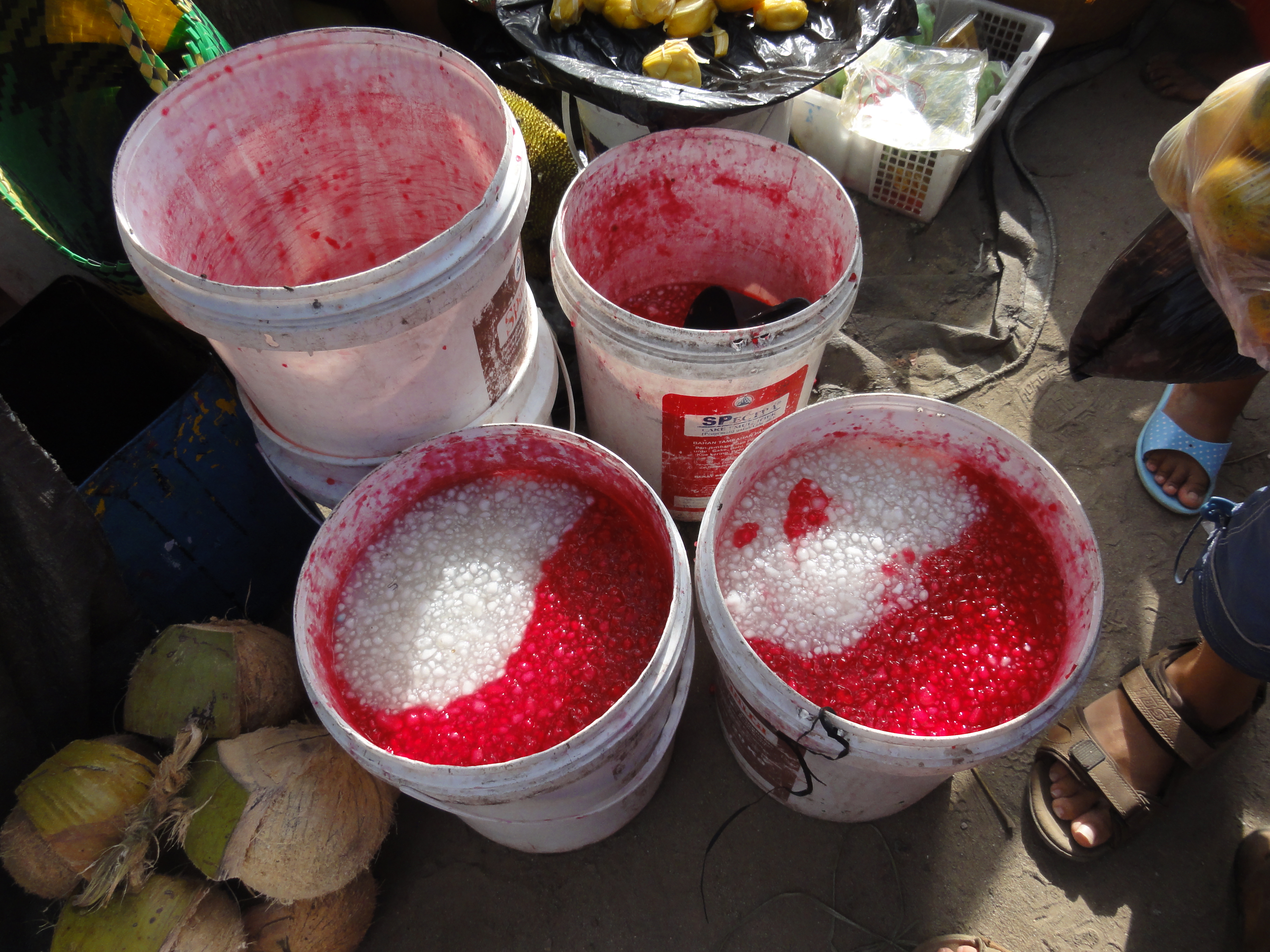 … ou des seaux remplis de billes gélatineuses colorées, que les indonésiens mangent dans des verres. N’avons vraiment pas envie d’essayer!
